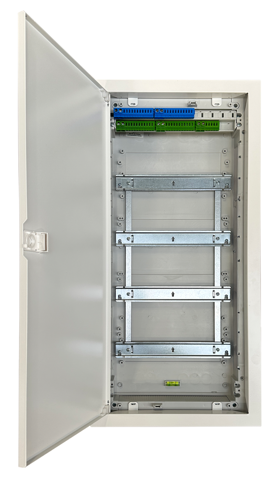 - bestehend aus: Grundgehäuse aus Kunststoff, Geräteträger 4-reihig zur Aufnahme von Reiheneinbaugeräten, Gerätefeldabdeckung 4-reihig bis 4x12 TE, 1x N/PE-Steckklemme, 1 Satz Befestigungsschrauben, 1 Aufputzrahmen mit Ausbrechmöglichkeit für Kabelkanal, 1 Türe mit klappbarem Schnappverschluss