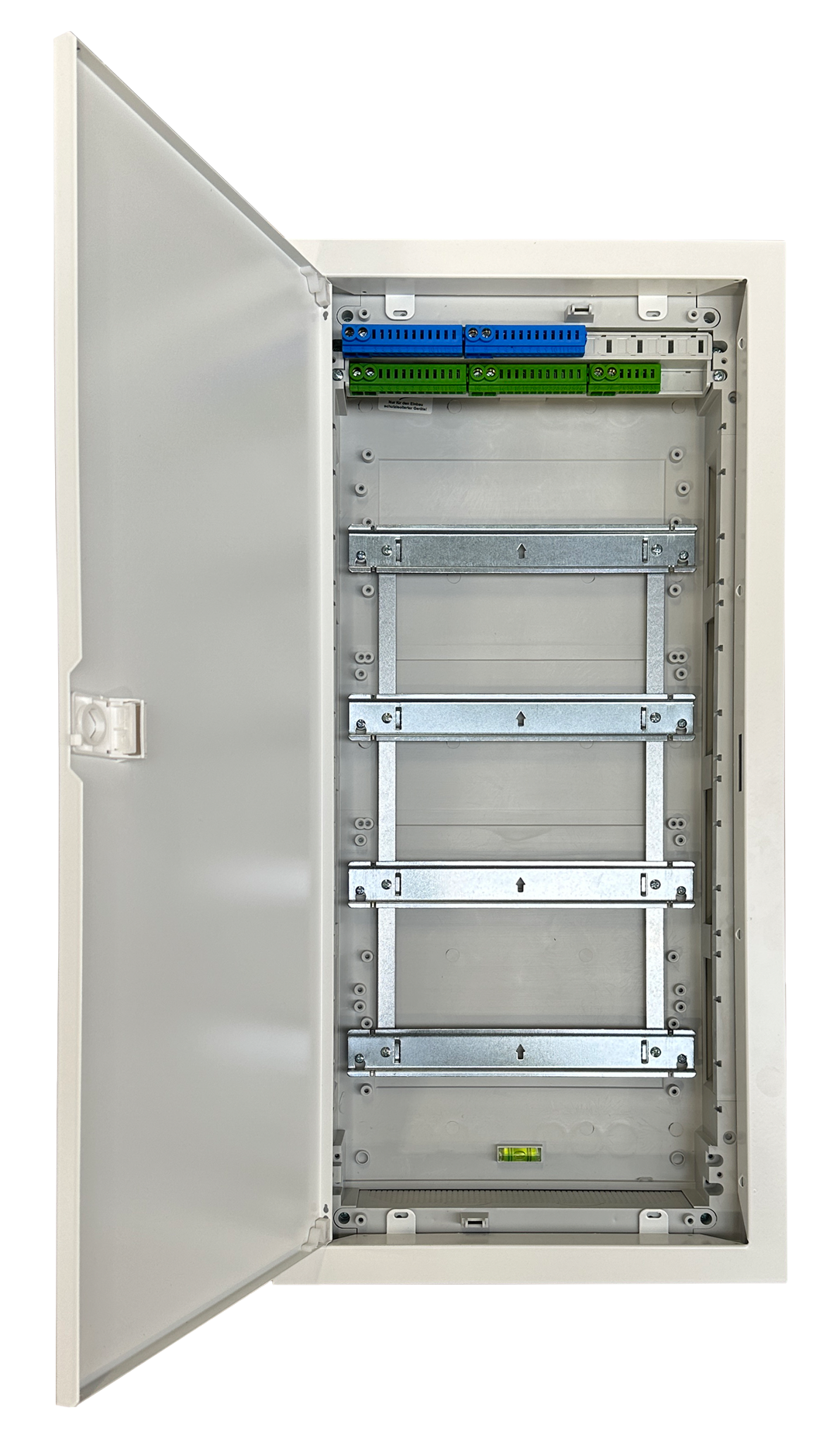 AKV 4.48ST Installations-Kleinverteiler POLARIS in Aufputzausführung 4-reihig Farbe RAL 9016 Außenmaße: BxHxT = 337x703x90 mm bestehend aus: - ausbrechbarer Stahlblechrahmen für Kabelkanal oben und unten - Einzeltür mit klappbarem Schnappverschluss späterer Schlosseinbau möglich - Wanne aus Kunststoff mit ausbrechbare Kabeleinführungen auf der Rückseite sowie oben und unten - Geräteträger 4-reihig zur Aufnahme von Reiheneinbaugeräten - Gerätefeldabdeckung 4-reihig bis 4x12 TE - 1x N/PE-Steckklemme - 1 Satz Befestigungsschrauben - Libelle für passgenauen Einbau (4 Einbaupositionen) - zusätzliche Steckvorrichtungen für Klemmen