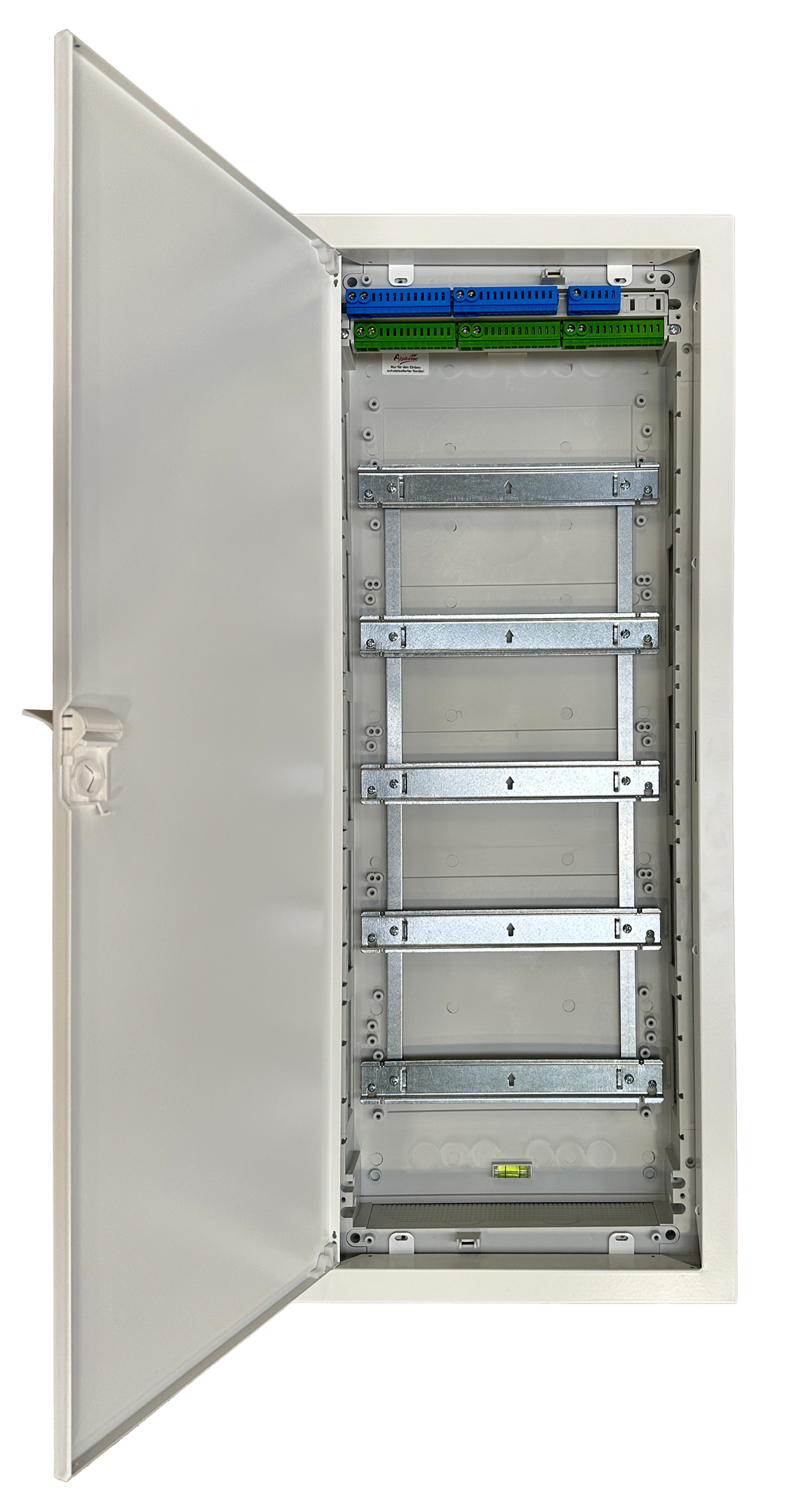 UKV 5.60ST Installations-Kleinverteiler POLARIS in Unterputzausführung 5-reihig Farbe RAL 9016 Außenmaße: BxHxT = 354x844x90 mm Einbaumaße: BxHxT = 308x798x87 mm bestehend aus: UP-Gehäuse aus Kunststoff ausbrechbarer Kabelschieber oben und unten Geräteträger 5-reihig zur Aufnahme von Reiheneinbaugeräten Gerätefeldabdeckung 5-reihig bis 5x12 TE 1x N/PE-Steckklemme 1 Satz Haltewinkel für Mauerbefestigung 1 UP-Blendrahmen mit Putzausgleichmöglichkeit bis 15 mm 1 Türe mit klappbarem Schnappverschluss späterer Schlosseinbau möglich Libelle für passgenauen Einbau (4 Einbaupositionen) zusätzliche Steckvorrichtungen für Klemmen