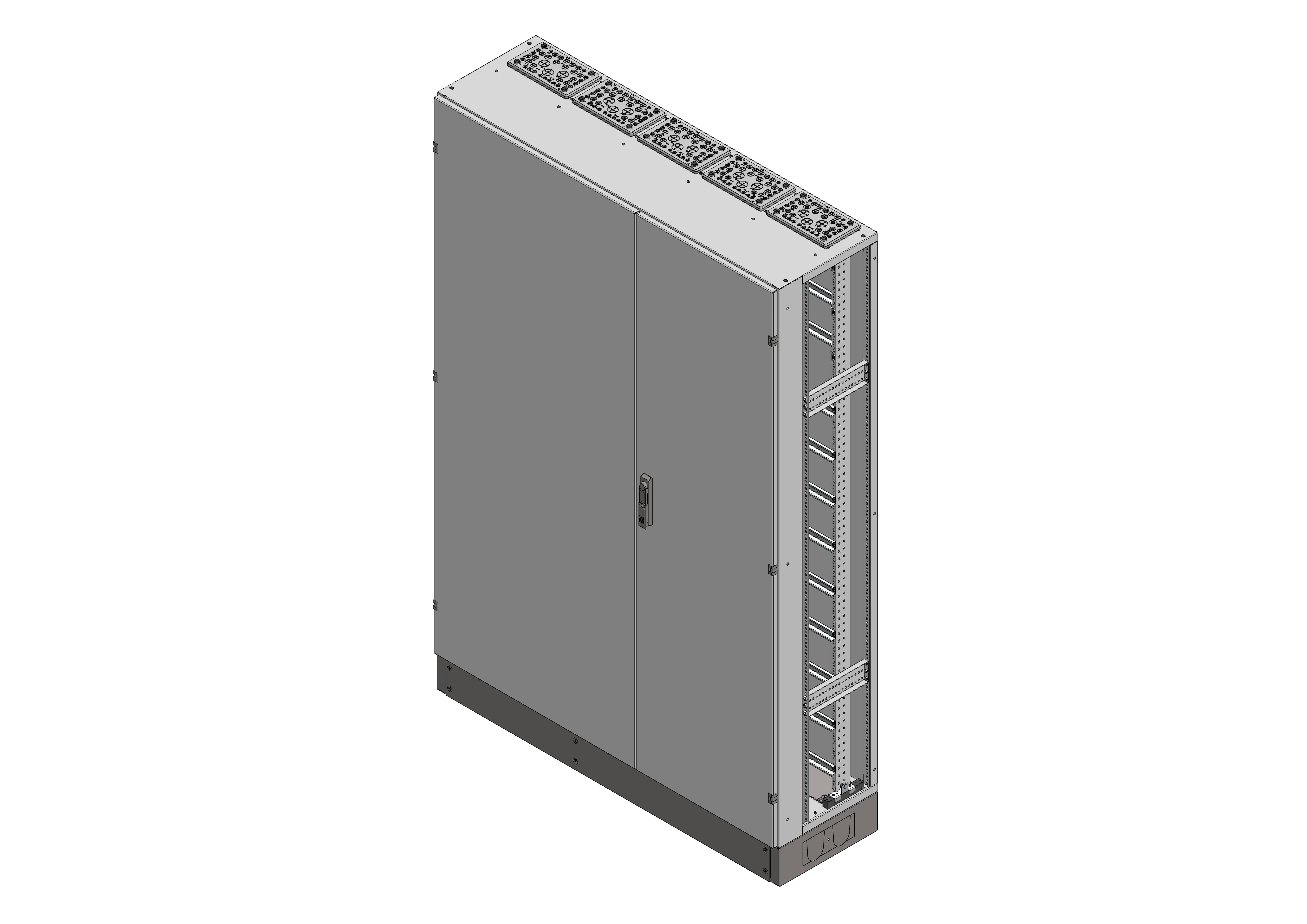RSVB5-12-400Reihenschaltschrank, RSVB, BxHxT = 1320x1870+130x400Schutzklasse I, IP54, RAL 7035offene Seitenwände, Seitenwandprofil gekantet, für SchrankverbindungBestehend aus:Gehäuse, Sockel, Doppeltür mit Schwenkhebel für PHZ, Flansche SF35 (oben) und SF32 (unten), komplettem Geräteträger mit Feldabdeckungen PRL, Wandhalterung, inkl. Verpackung