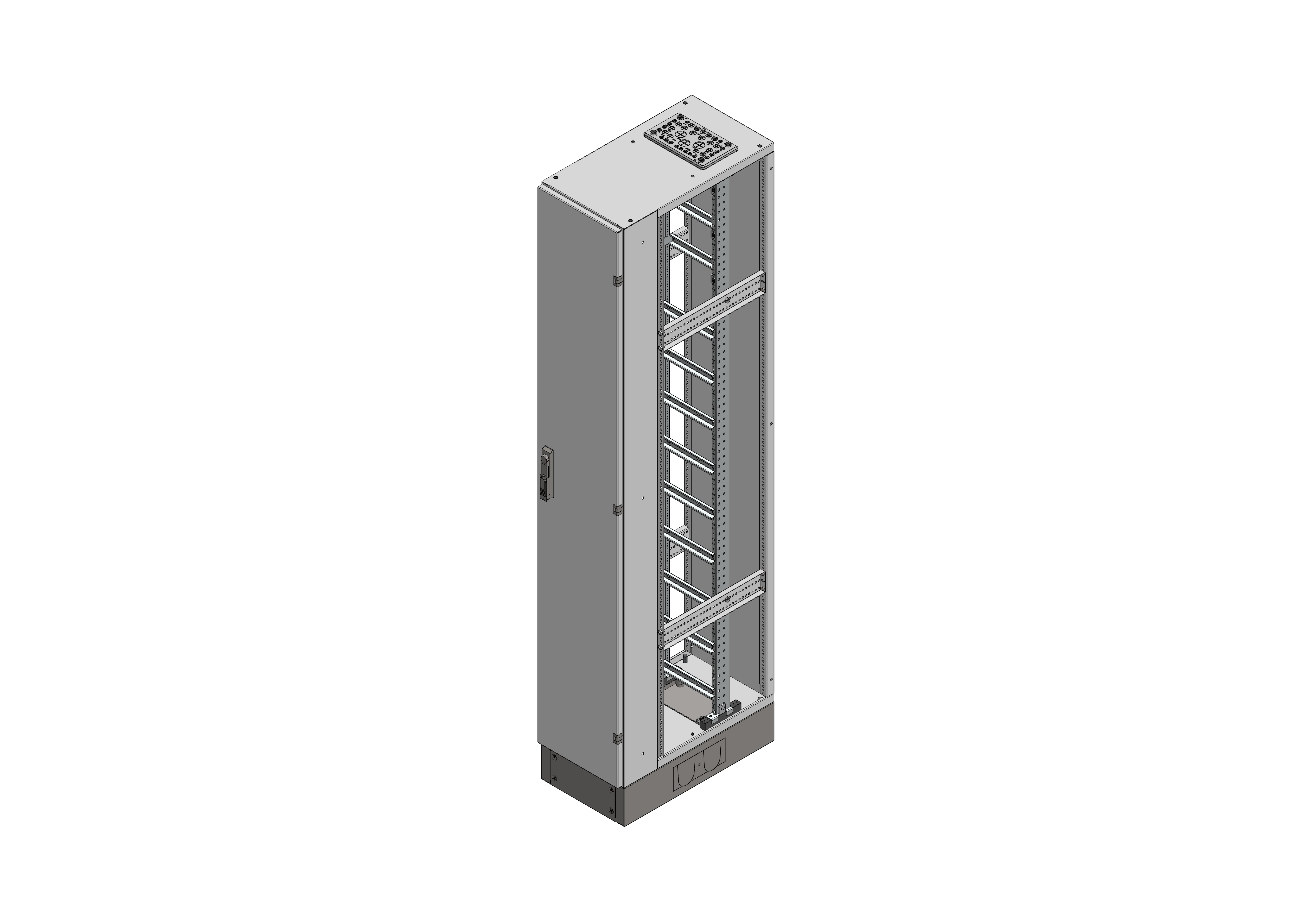 RSVB1-12-600 Reihenschaltschrank, RSVB, BxHxT = 1570x1870+130x600 Schutzklasse I, IP54, RAL 7035 offene Seitenwände, Seitenwandprofil gekantet, für Schrankverbindung Bestehend aus: Gehäuse, Sockel, Einzeltür mit Schwenkhebel für PHZ, Flansche SF35 (oben) und SF32 (unten), komplettem Geräteträger mit Feldabdeckungen PRL, Wandhalterung, inkl. Verpackung