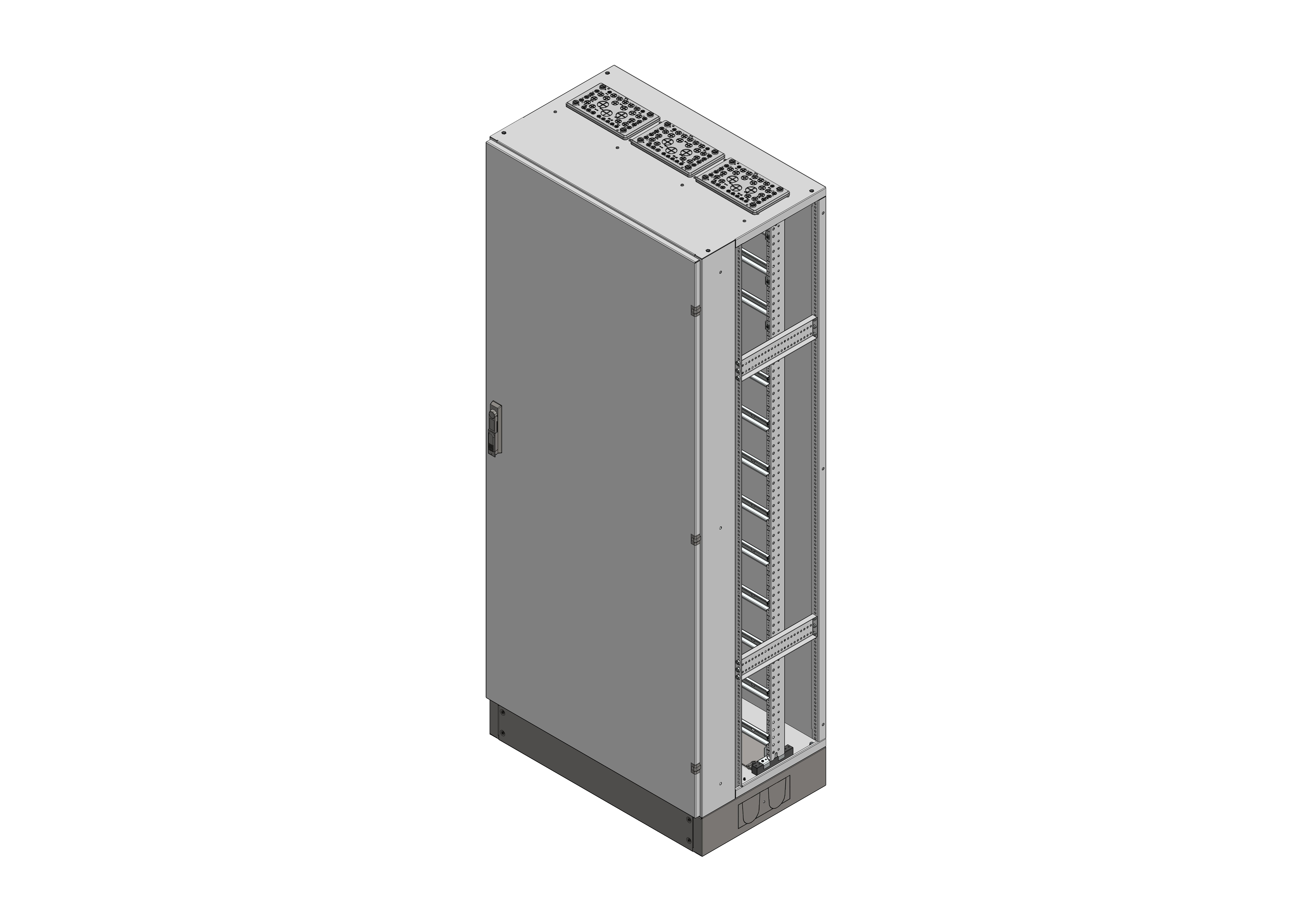 RSVB3-12-500Reihenschaltschrank, RSVB, BxHxT = 820x1870+130x500Schutzklasse I, IP54, RAL 7035offene Seitenwände, Seitenwandprofil gekantet, für SchrankverbindungBestehend aus:Gehäuse, Sockel, Einzeltür mit Schwenkhebel für PHZ, Flansche SF35 (oben) und SF32 (unten), komplettem Geräteträger mit Feldabdeckungen PRL, Wandhalterung, inkl. Verpackung