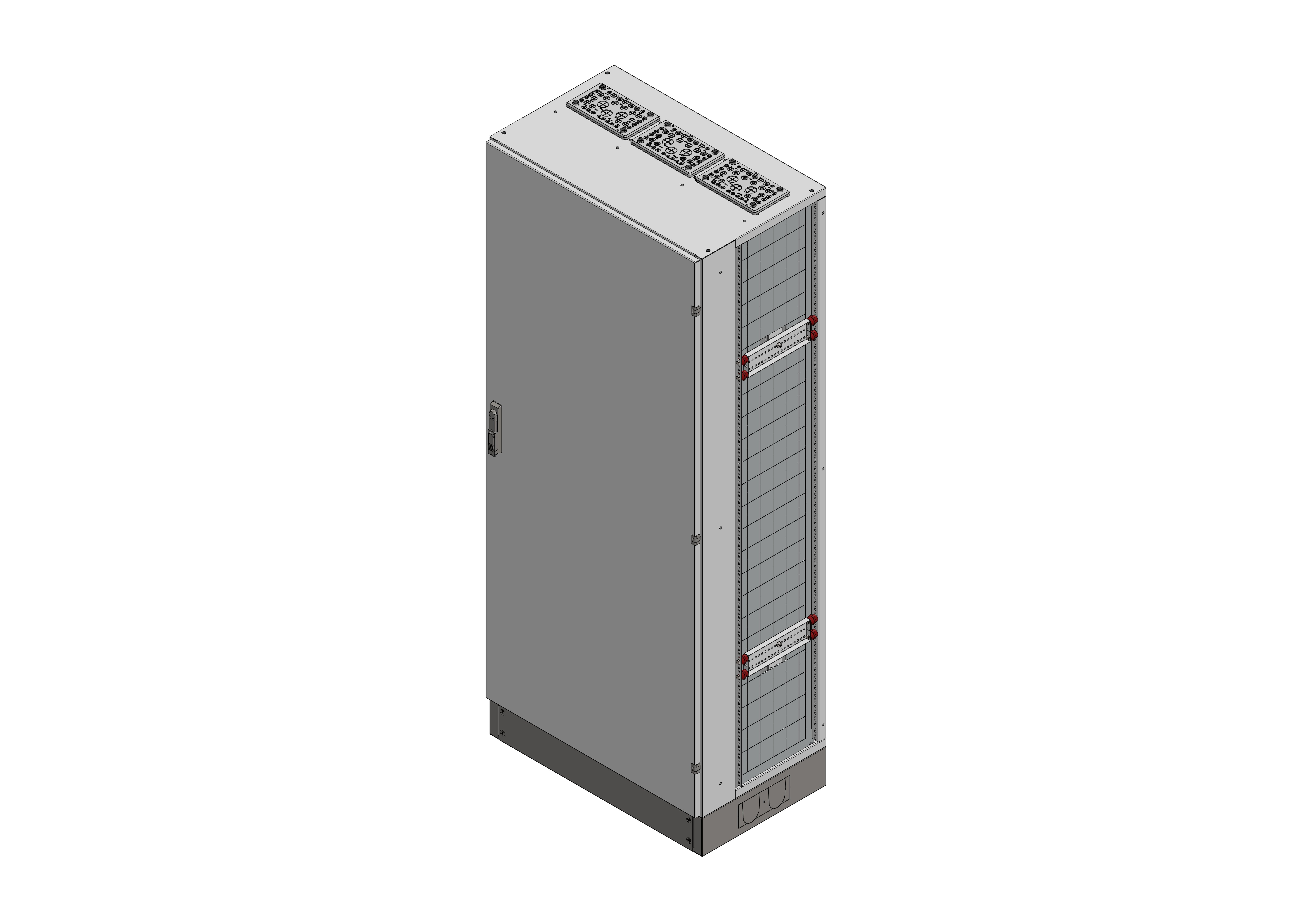 RSVK3-12-500Reihenschaltschrank, RSVK, BxHxT = 820x1870+130x500Schutzklasse II, IP54, RAL 7035offene Seitenwände, Seitenwandprofil gekantet, für SchrankverbindungBestehend aus:Gehäuse, Sockel, Einzeltür mit Schwenkhebel für PHZ, Flansche SF35 (oben) und SF32 (unten), komplettem Geräteträger mit Feldabdeckungen PRL, Wandhalterung, inkl. Verpackung