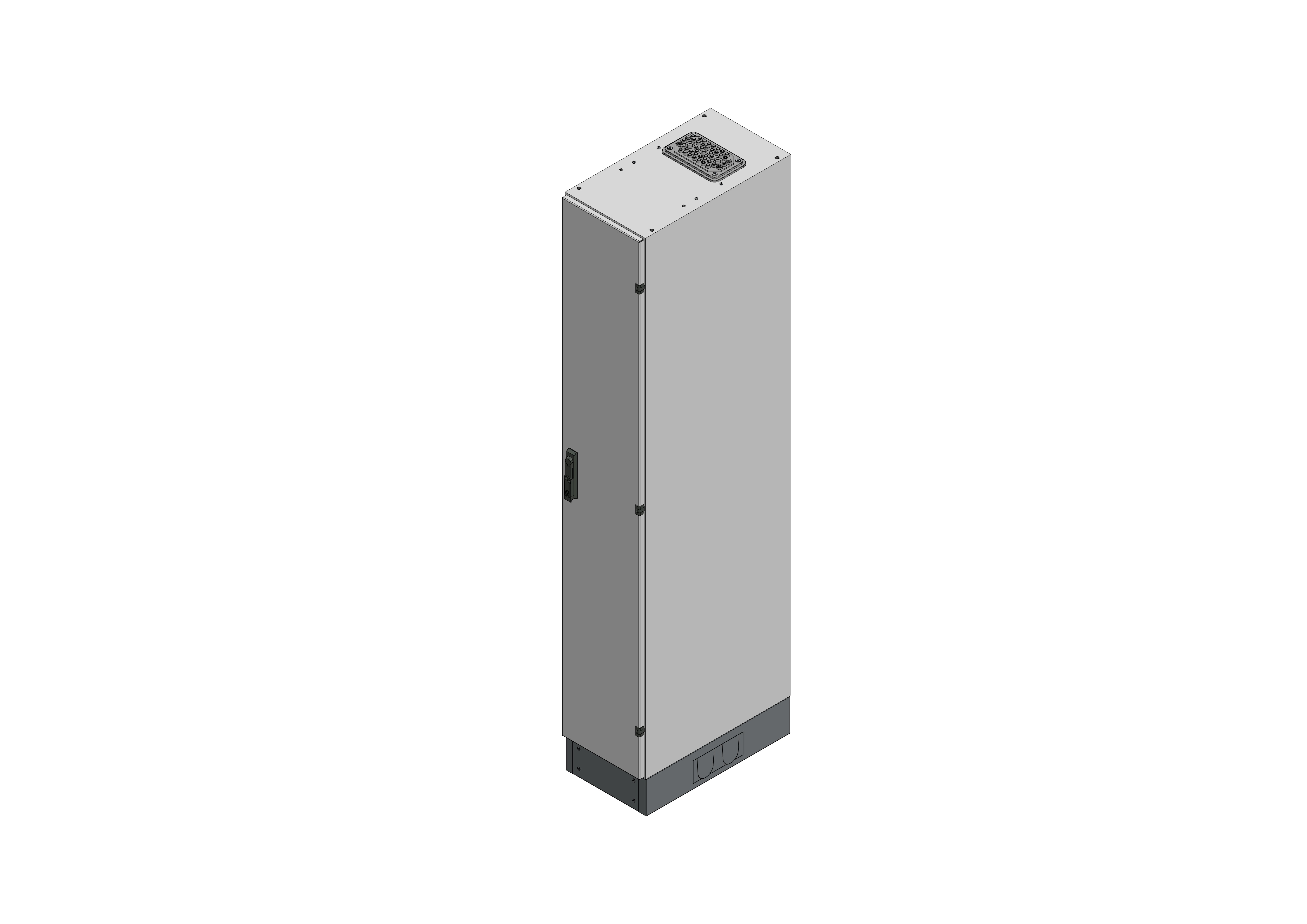 SVB1-12-600Standverteilung, SVB, BxHxT = 320x1870+130x600Schutzklasse I, IP54, RAL 7035Bestehend aus:Gehäuse, Sockel, Einzeltür mit Schwenkhebel für PHZ, Flansche SF35 (oben) und SF32 (unten), komplettem Geräteträger mit Feldabdeckungen PRL, Wandhalterung, inkl. Verpackung