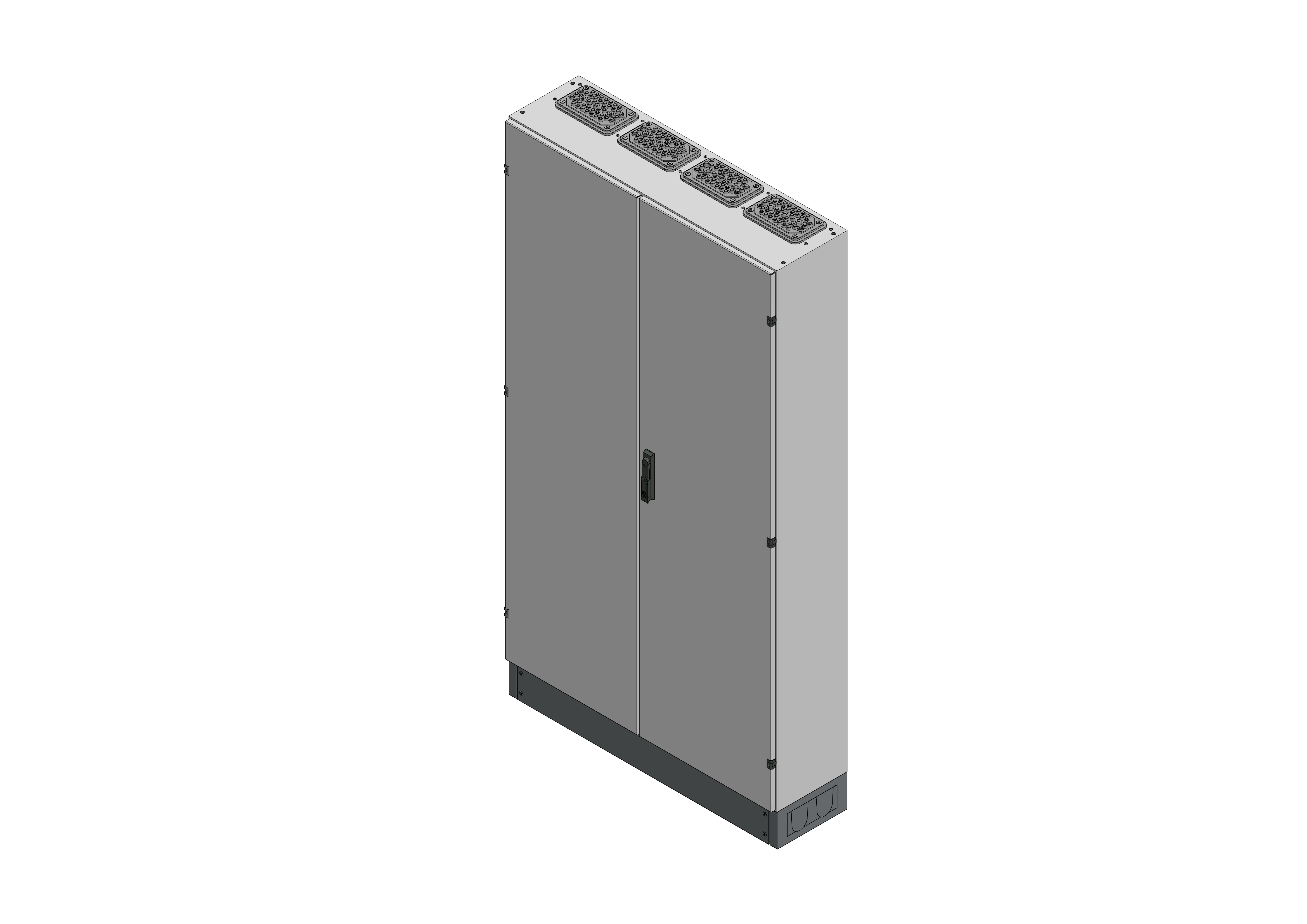 SVK4-12-300Standverteilung, SVK, BxHxT = 1070x1870+130x300Schutzklasse II, IP54, RAL 7035Bestehend aus:Gehäuse, Sockel, Doppeltür mit Schwenkhebel für PHZ, Flansche SF35 (oben) und SF32 (unten), komplettem Geräteträger mit Feldabdeckungen PRL, Wandhalterung, inkl. Verpackung