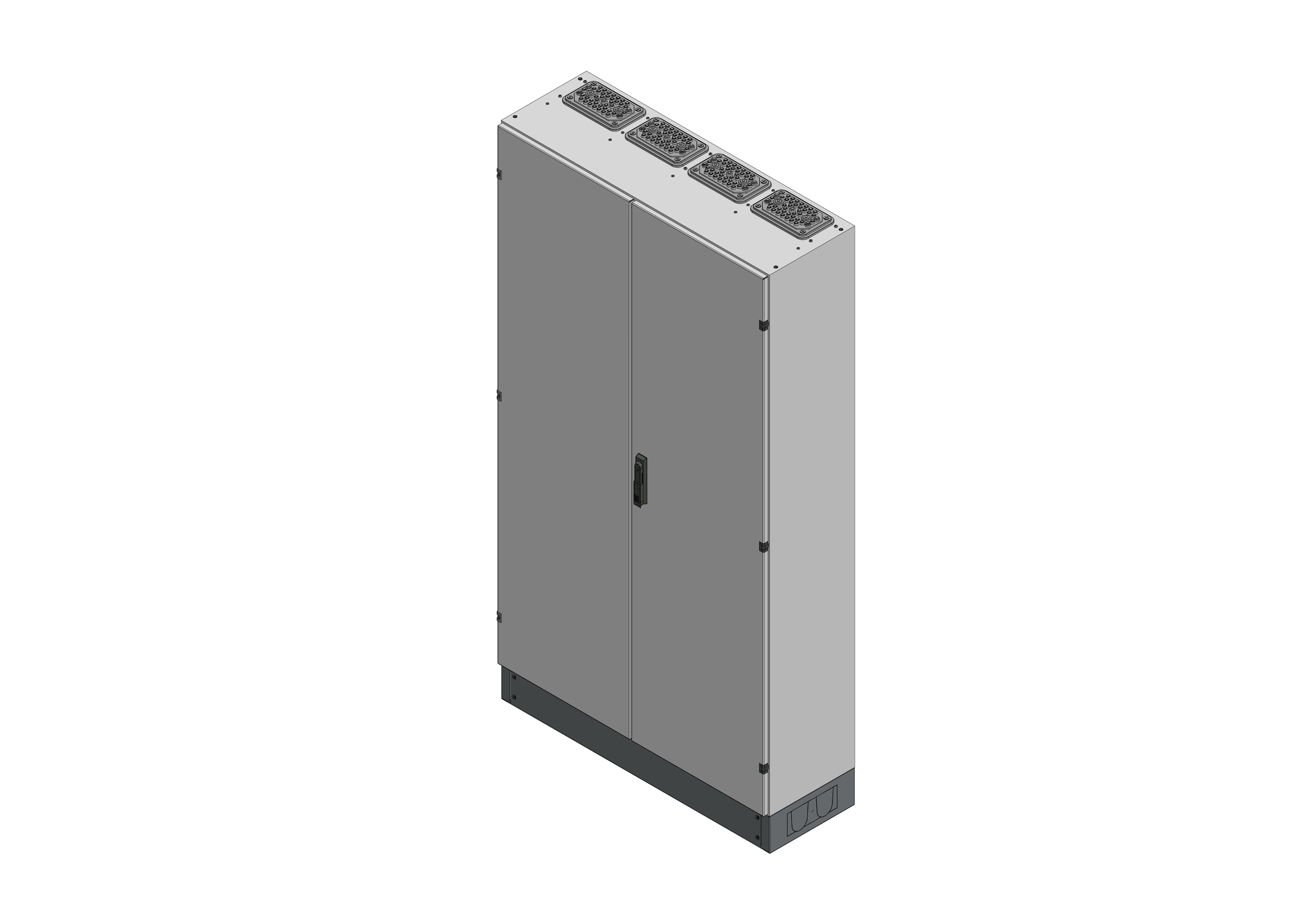 SVK4-12-360 Standverteilung, SVK, BxHxT = 1070x1870+130x360 Schutzklasse II, IP54, RAL 7035 Bestehend aus: Gehäuse, Sockel, Doppeltür mit Schwenkhebel für PHZ, Flansche SF35 (oben) und SF32 (unten), komplettem Geräteträger mit Feldabdeckungen PRL, Wandhalterung, inkl. Verpackung