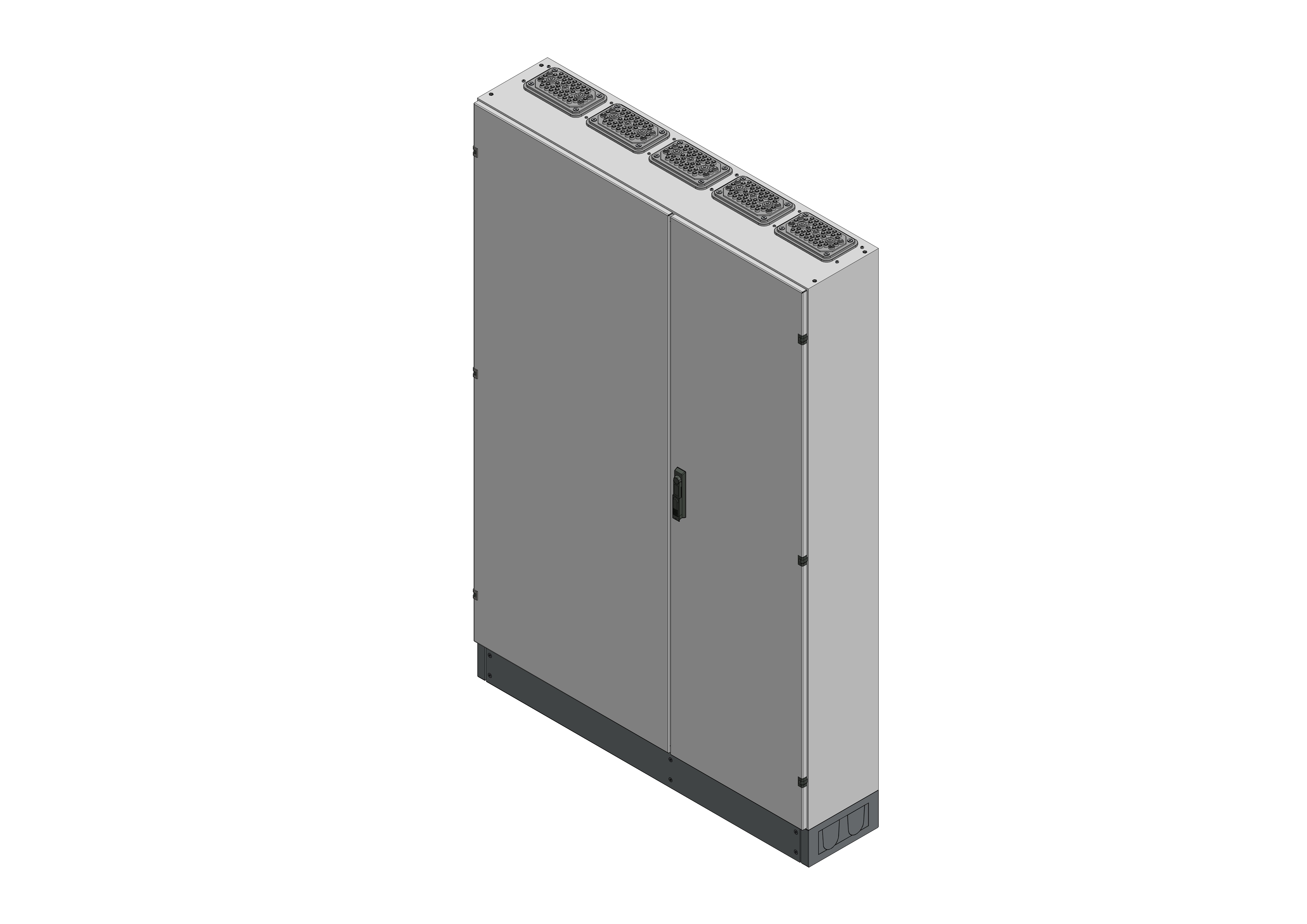 SVK5-12-300Standverteilung, SVK, BxHxT = 1320x1870+130x300Schutzklasse II, IP54, RAL 7035Bestehend aus:Gehäuse, Sockel,Doppeltür mit Schwenkhebel für PHZ, Flansche SF35 (oben) und SF32 (unten), komplettem Geräteträger mit Feldabdeckungen PRL, Wandhalterung, inkl. Verpackung