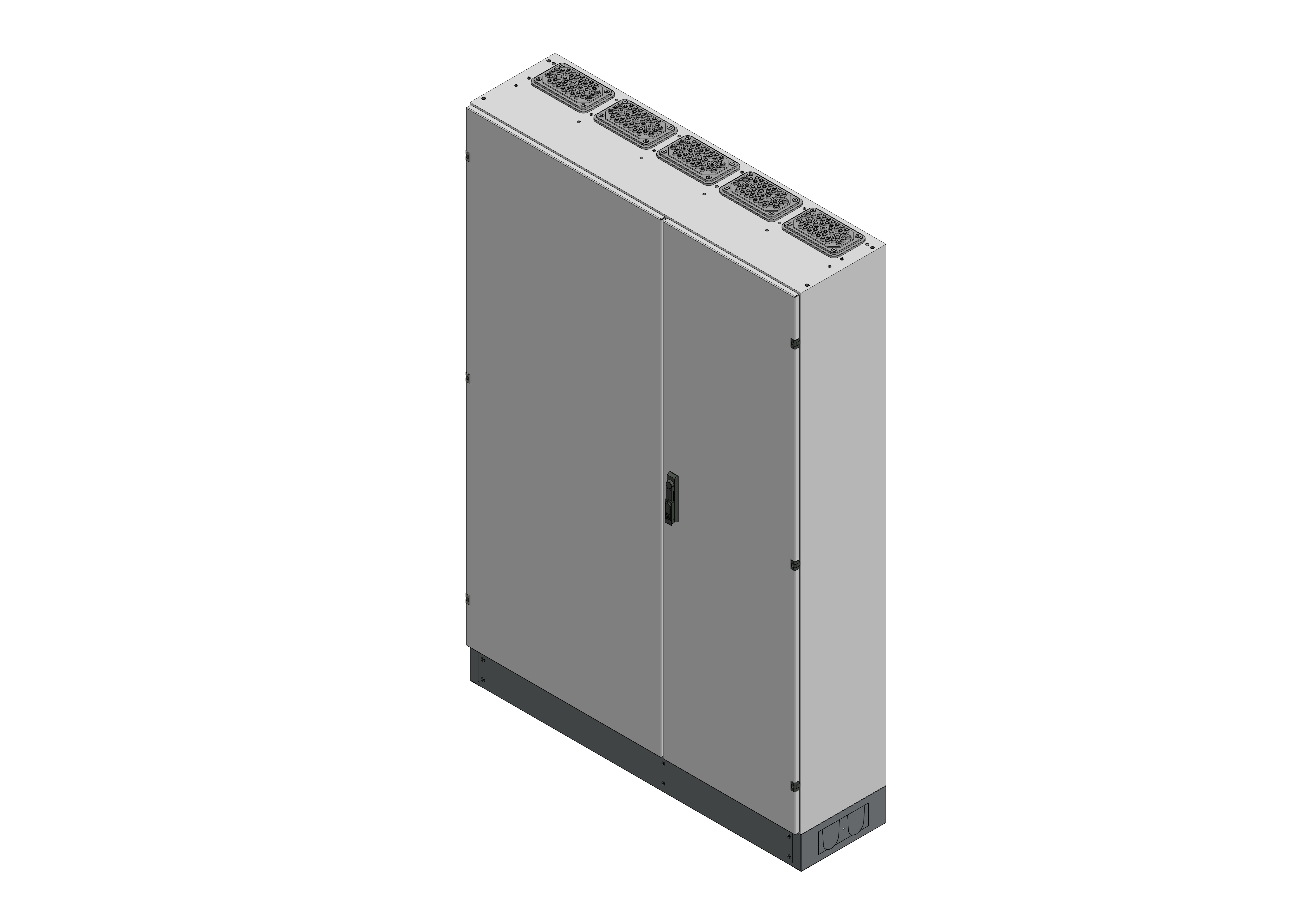 SVK5-12-360Standverteilung, SVK, BxHxT = 1320x1870+130x360Schutzklasse II, IP54, RAL 7035Bestehend aus:Gehäuse, Sockel, Doppeltür mit Schwenkhebel für PHZ, Flansche SF35 (oben) und SF32 (unten), komplettem Geräteträger mit Feldabdeckungen PRL, Wandhalterung, inkl. Verpackung