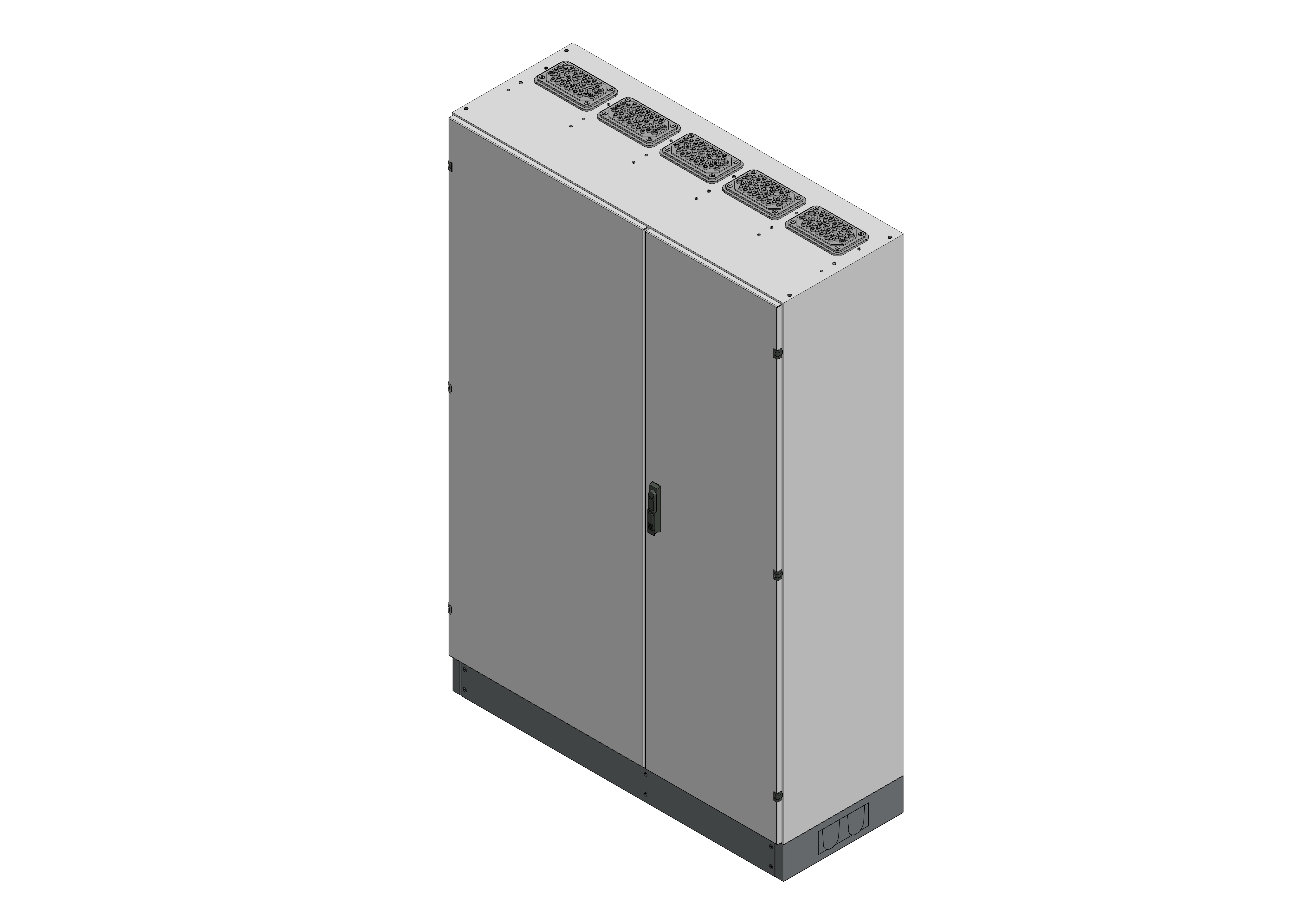 SVK5-12-500Standverteilung, SVK, BxHxT = 1320x1870+130x500Schutzklasse II, IP54, RAL 7035Bestehend aus:Gehäuse, Sockel, Doppeltür mit Schwenkhebel für PHZ, Flansche SF35 (oben) und SF32 (unten), komplettem Geräteträger mit Feldabdeckungen PRL, Wandhalterung, inkl. Verpackung