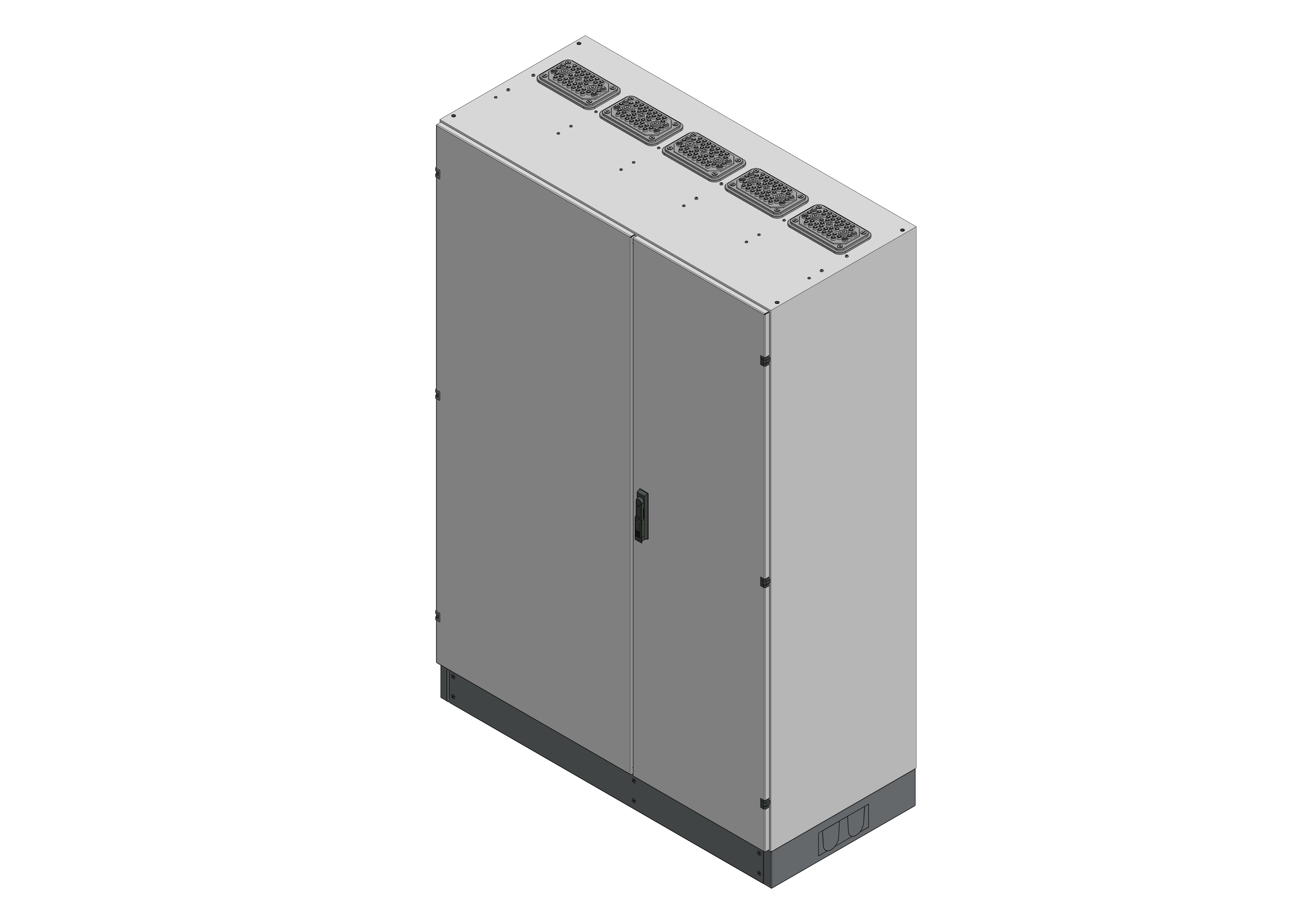 SVK5-12-600Standverteilung, SVK, BxHxT = 1320x1870+130x600Schutzklasse II, IP54, RAL 7035Bestehend aus:Gehäuse, Sockel, Doppeltür mit Schwenkhebel für PHZ, Flansche SF35 (oben) und SF32 (unten), komplettem Geräteträger mit Feldabdeckungen PRL, Wandhalterung, inkl. Verpackung