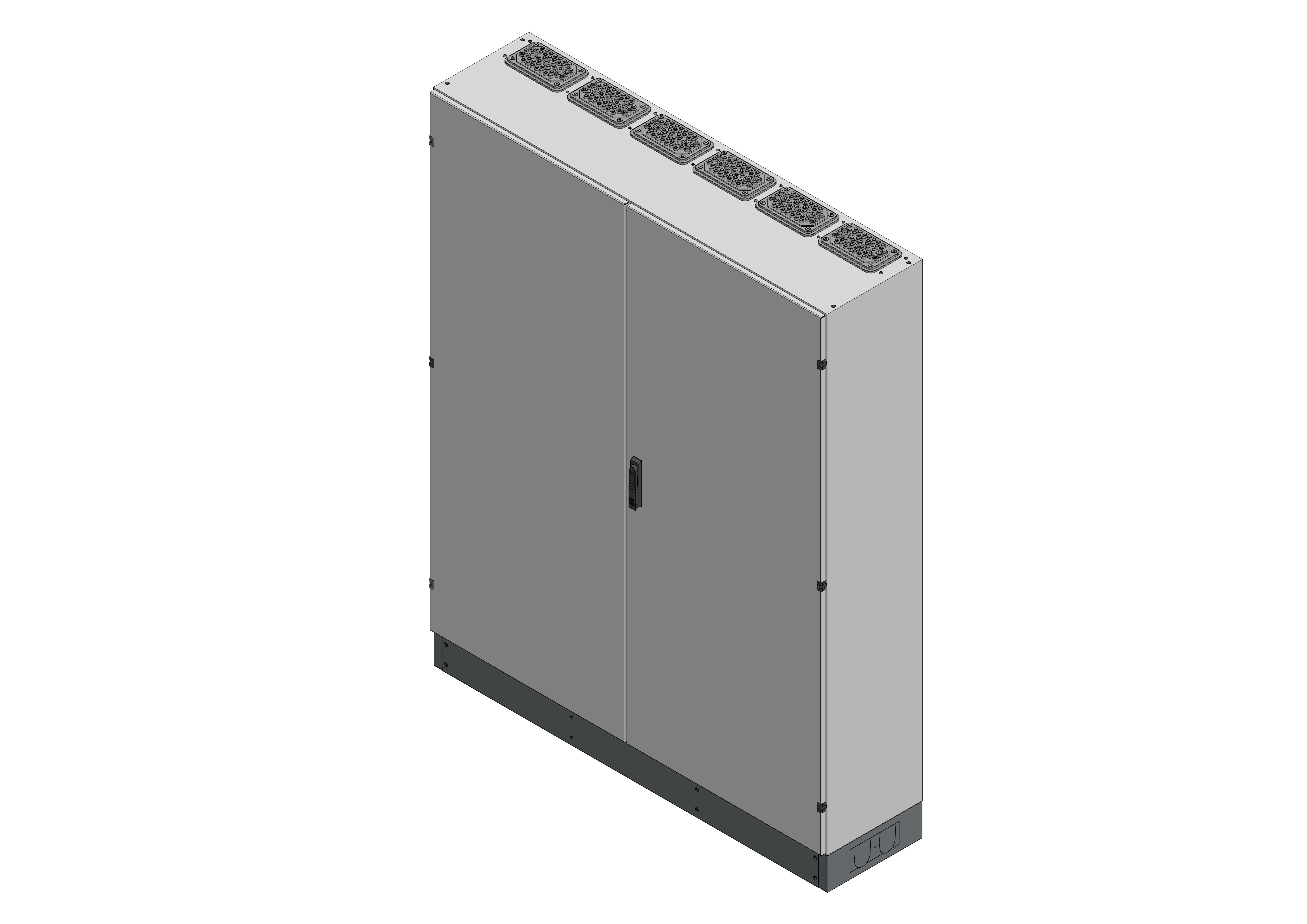 SVK6-12-400Standverteilung, SVK, BxHxT = 1570x1870+130x400Schutzklasse II, IP54, RAL 7035Bestehend aus:Gehäuse, Sockel, Doppeltür mit Schwenkhebel für PHZ, Flansche SF35 (oben) und SF32 (unten), komplettem Geräteträger mit Feldabdeckungen PRL, Wandhalterung, inkl. Verpackung