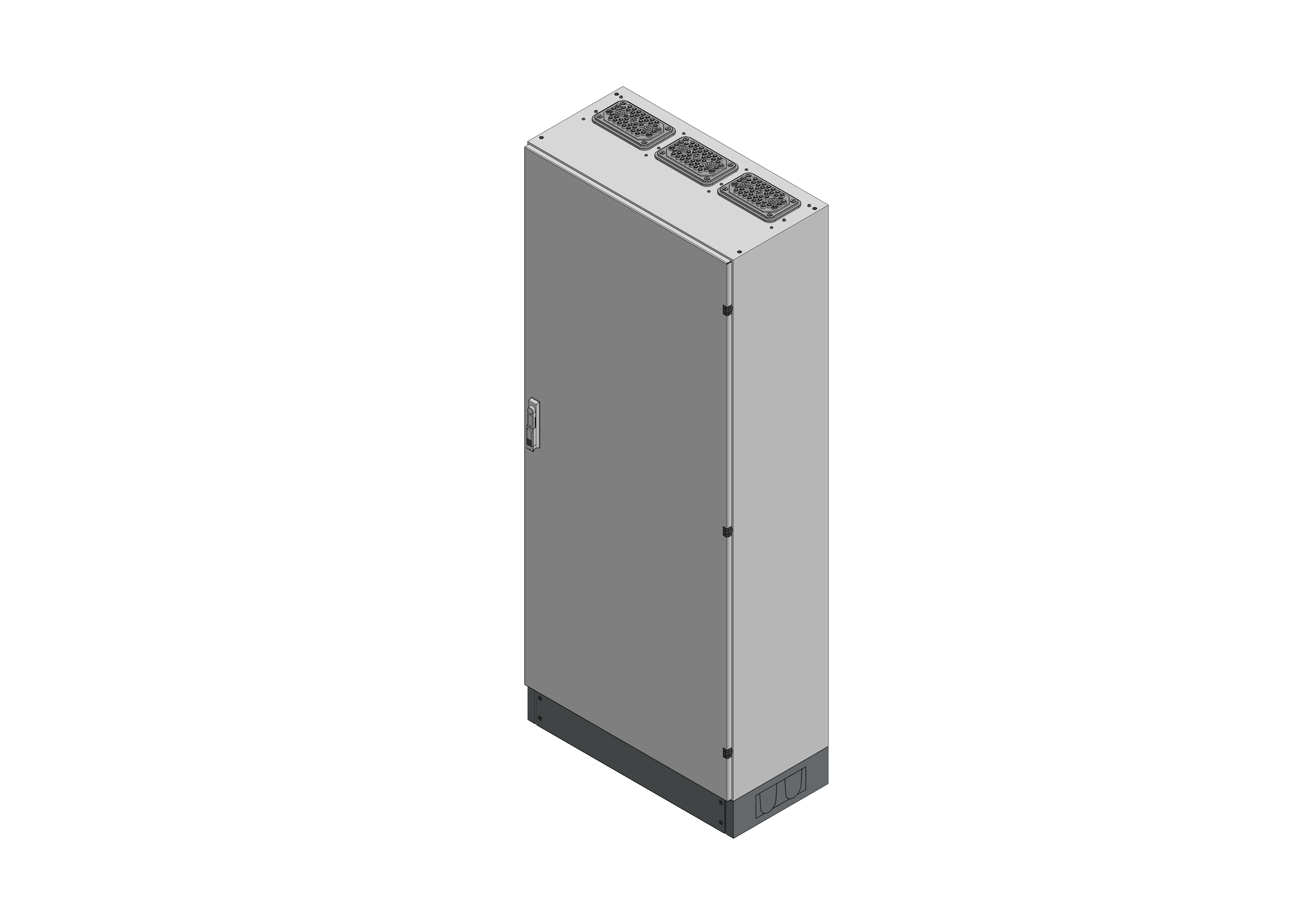 SVK3-12-400Standverteilung, SVK, BxHxT = 820x1870+130x400Schutzklasse II, IP54, RAL 7035Bestehend aus:Gehäuse, Sockel, Einzeltür mit Schwenkhebel für PHZ, Flansche SF35 (oben) und SF32 (unten), komplettem Geräteträger mit Feldabdeckungen PRL, Wandhalterung, inkl. Verpackung