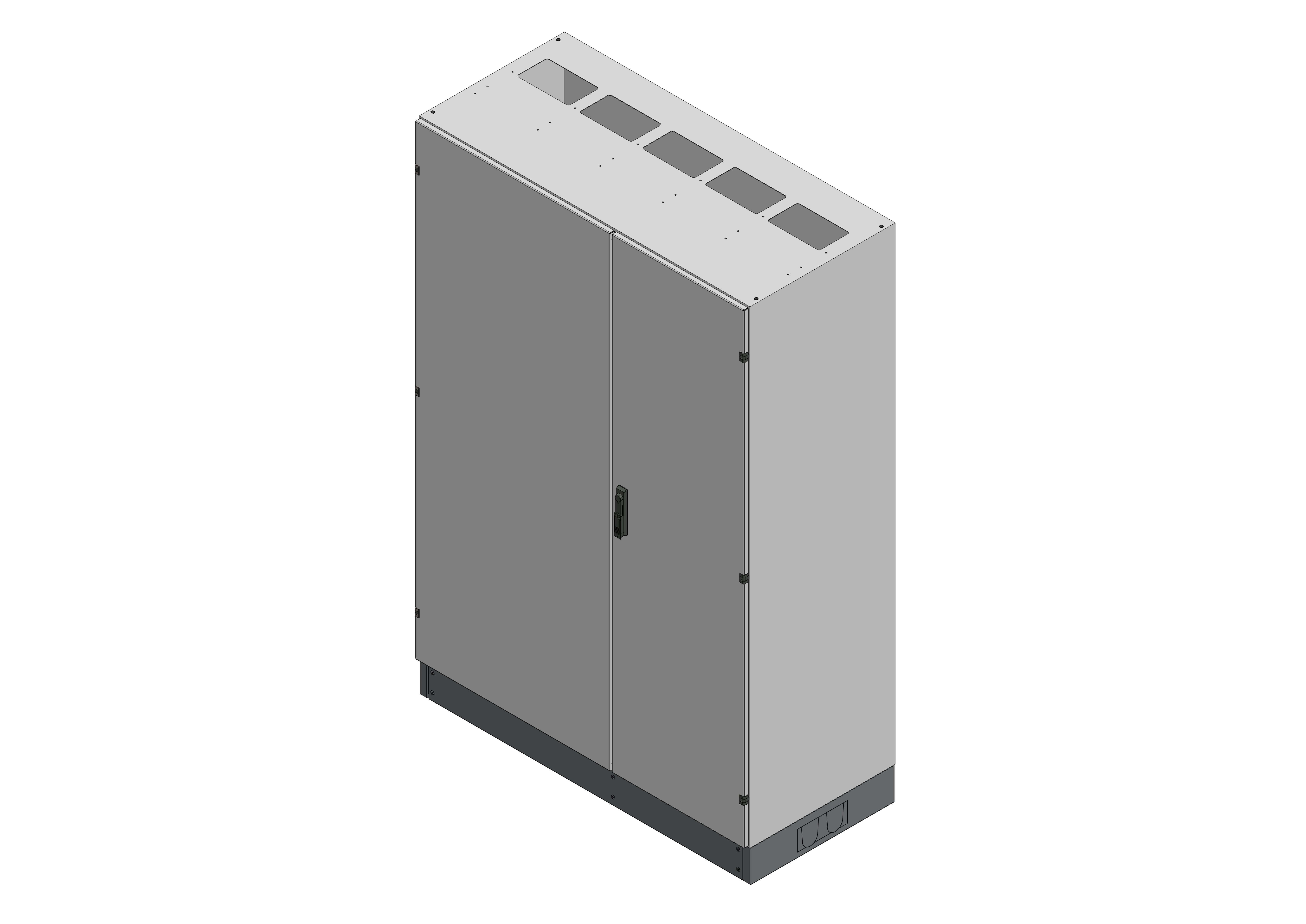 L-SVK5-12-600Leergehäuse Standverteilung, SVK, BxHxT = 1320x1870+130x600Schutzklasse II, IP54, RAL 7035Bestehend aus:Gehäuse, Sockel, Doppeltür mit Schwenkhebel für PHZ, Wandhalterung, ohne Flansche, inkl. Verpackung