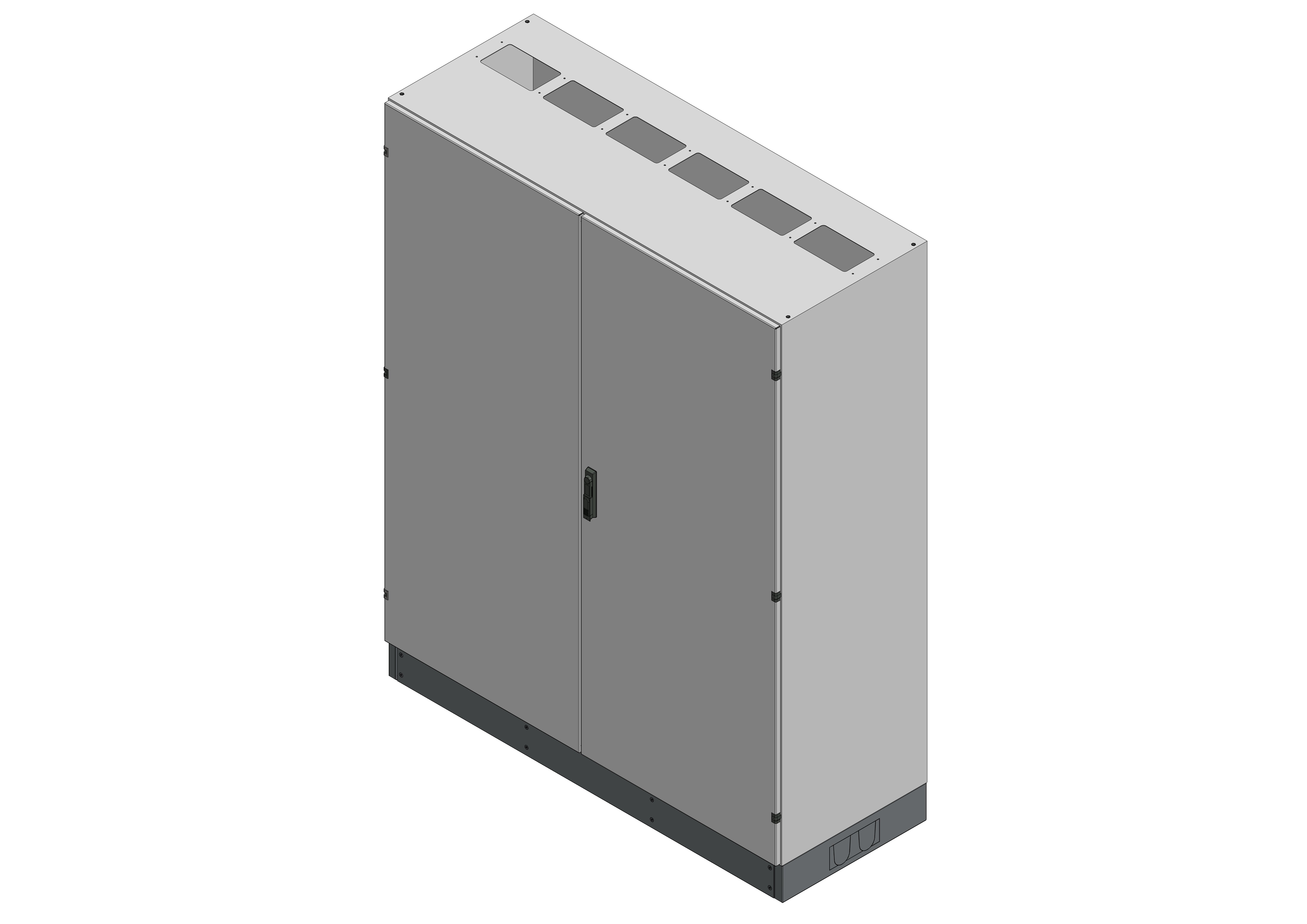 L-SVK6-12-600Leergehäuse Standverteilung, SVK, BxHxT = 1570x1870+130x600Schutzklasse II, IP54, RAL 7035Bestehend aus:Gehäuse, Sockel, Doppeltür mit Schwenkhebel für PHZ, Wandhalterung, ohne Flansche, inkl. Verpackung