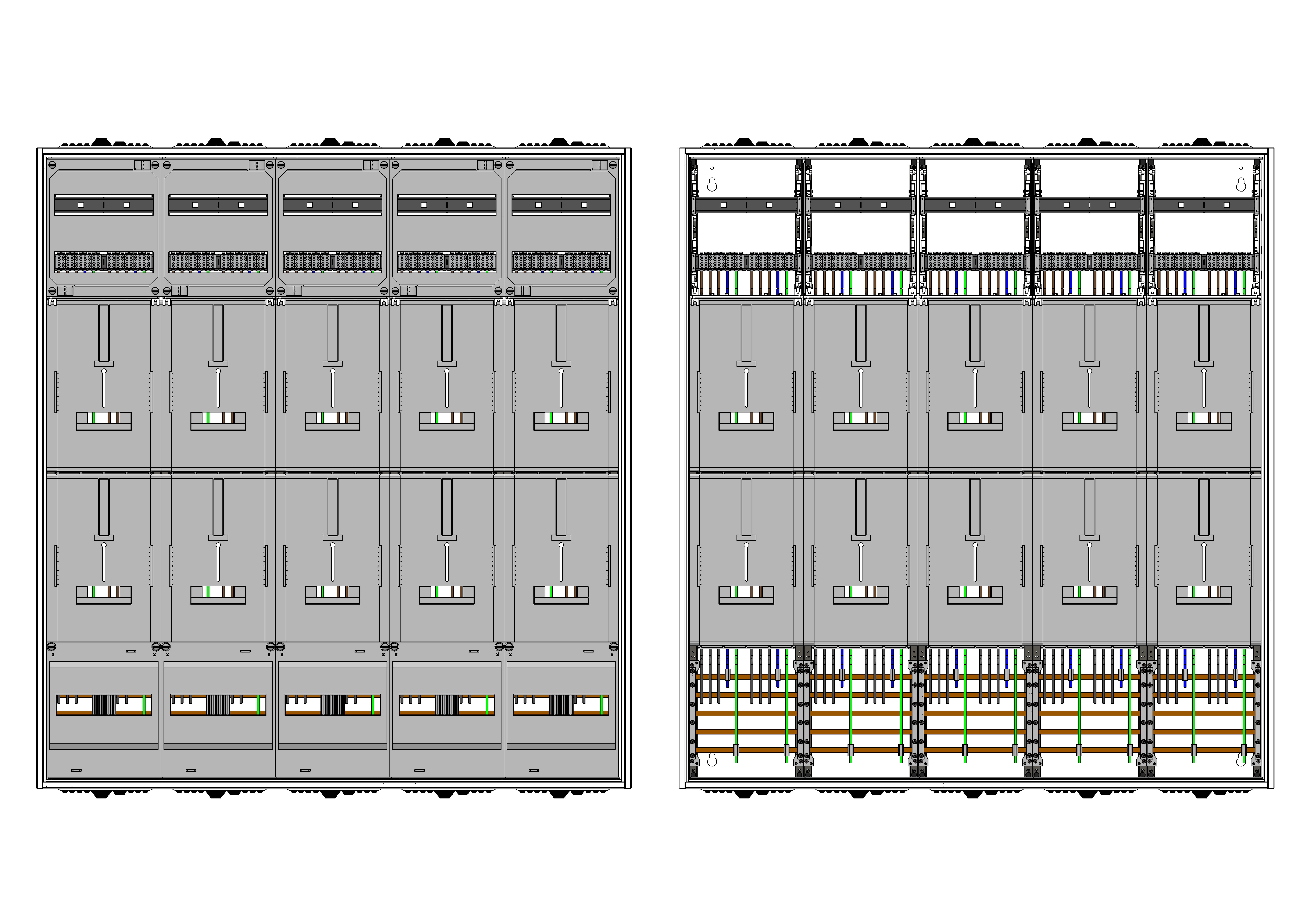 AZ102H-210, Zählerverteilung HEART für Zählerplatz mit 3-Punktbefestigung nach VDE 0603, DIN43870, 4100:2019-04 für den Innenbereich für Wandbefestigung AP/UP, Fabr. Alphatec, BxHxT [mm] = 1300x1400x210, Schutzklasse II, IP41, RAL 9016, Bestehend aus: Gehäuse, Doppeltür mit Drehriegel, Flansche NF1 (oben + unten) und Berührungsschutzabdeckungen, Easy-Fix Befestigungssystem zur einfachen Aufhängung";" flexible Seitenleisten für eine einfache Hutschienenmontage auf verschiedenen Ebenen";" zusätzliche Klemmvorrichtungen für Steckklemmen";", aufgebaut wie folgt: 9x Zählerplatz, 1x TSG-Platte, inkl. Querverdrahtung, komplett zusammengebaut und verdrahtet gemäß VNB.0001