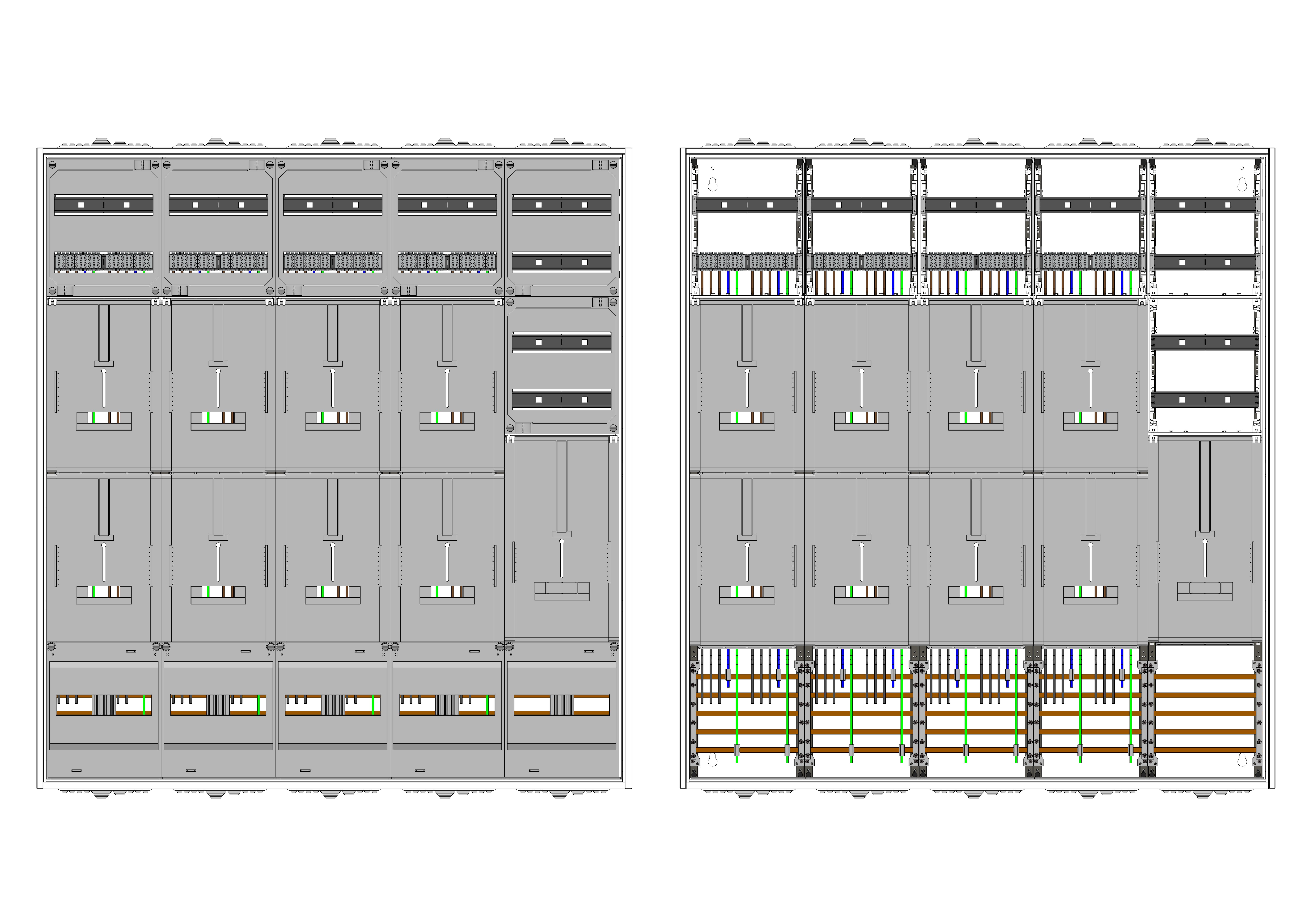 AZ102HS1-230, Zählerverteilung mit 3-Punktnach VDE 0603, DIN43870, 4100:2019-04 für den Innenbereich für Wandbefestigung AP/UP, Fabr. Alphatec, BxHxT [mm] = 1300x1400x230, Schutzklasse II, IP54, RAL 7035, Bestehend aus: Gehäuse, Einzel- bzw. Doppeltür mit Drehriegel, Flansche SF45 (oben) und SF41 (unten) und Berührungsschutzabdeckungen, aufgebaut wie folgt: 8xZählerplatz, TSG, Verteilerfeld (12TE), externer APZ erforderlich, inkl. Querverdrahtung, komplett zusammengebaut und verdrahtet gemäß VNB.0149