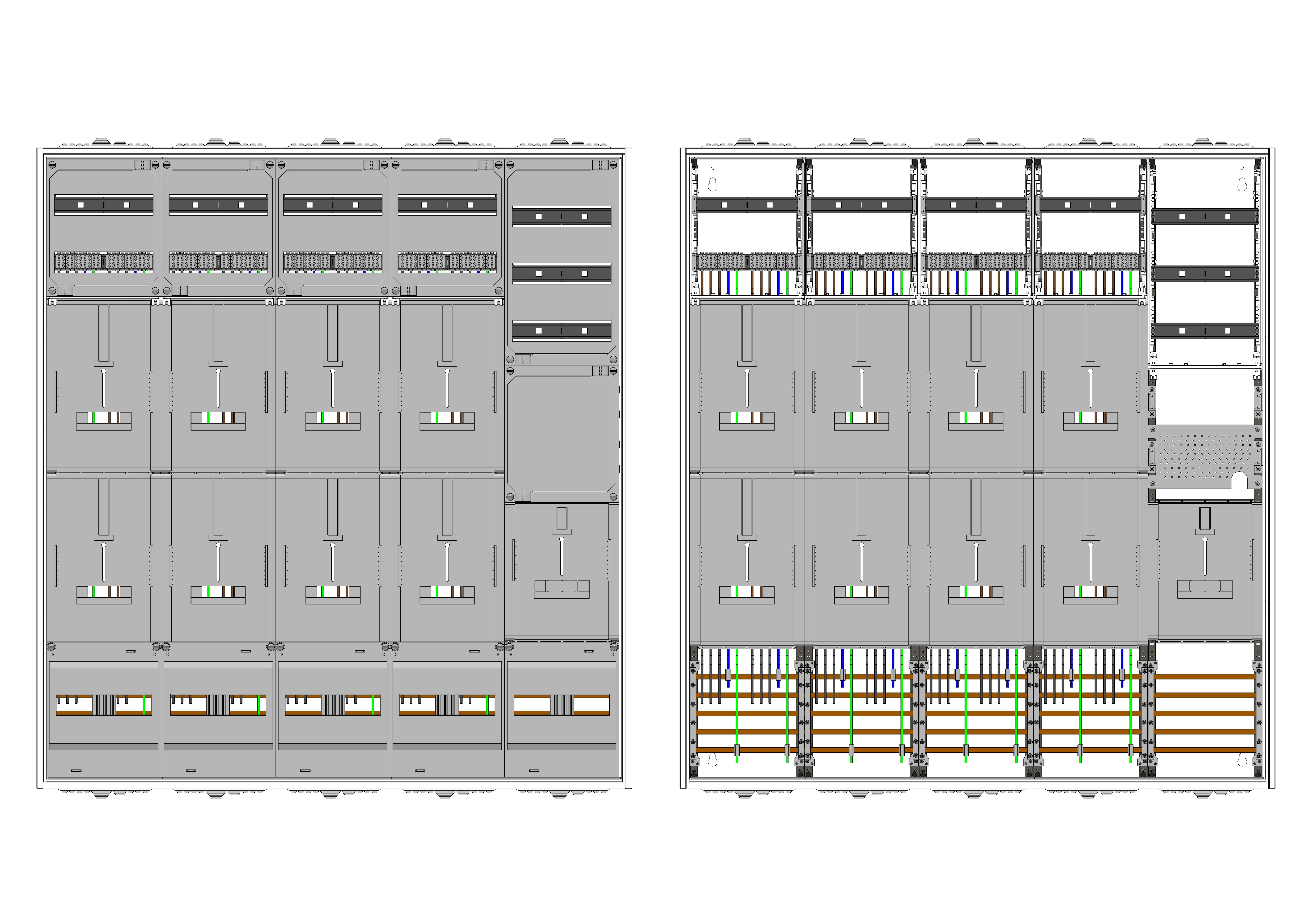 AZ102HS1A-210-9, Zählerverteilung HEART mit 3-Punktbefestignach VDE 0603, DIN43870, 4100:2019-04 für den Innenbereich für Wandbefestigung AP/UP, Fabr. Alphatec, BxHxT [mm] = 1300x1400x210, Schutzklasse II, IP41, RAL 9016, Bestehend aus: Gehäuse, Einzel- bzw. Doppeltür mit Drehriegel, Flansche NF1 (oben + unten) und Berührungsschutzabdeckungen, Easy-Fix Befestigungssystem zur einfachen Aufhängung";" flexible Seitenleisten für eine einfache Hutschienenmontage auf verschiedenen Ebenen";" zusätzliche Klemmvorrichtungen für Steckklemmen";", aufgebaut wie folgt: 8xZählerplatz, TSG, Verteilerfeld (12TE), APZ in Verteilerfeld, inkl. Querverdrahtung, komplett zusammengebaut und verdrahtet gemäß VNB.0076