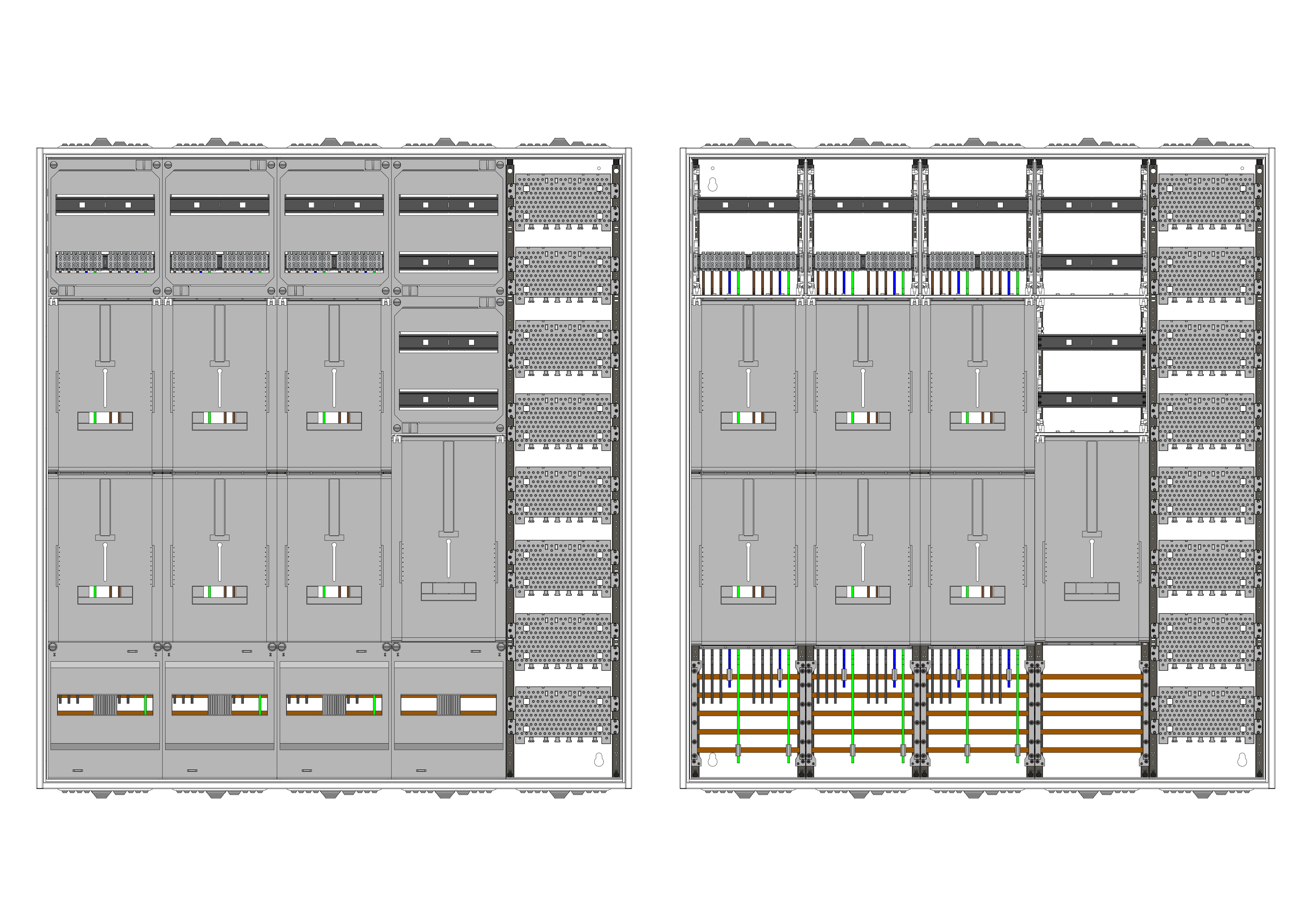 AZ102HS1M2-230, Zählerverteilung mit 3-Punktnach VDE 0603, DIN43870, 4100:2019-04 für den Innenbereich für Wandbefestigung AP/UP, Fabr. Alphatec, BxHxT [mm] = 1300x1400x230, Schutzklasse II, IP54, RAL 7035, Bestehend aus: Gehäuse, Einzel- bzw. Doppeltür mit Drehriegel, Flansche SF45 (oben) und SF41 (unten) und Berührungsschutzabdeckungen, aufgebaut wie folgt: 6xZählerplatz, TSG, Verteilerfeld (12TE), Medienfeld, externer APZ erforderlich, inkl. Querverdrahtung, komplett zusammengebaut und verdrahtet gemäß VNB.0199