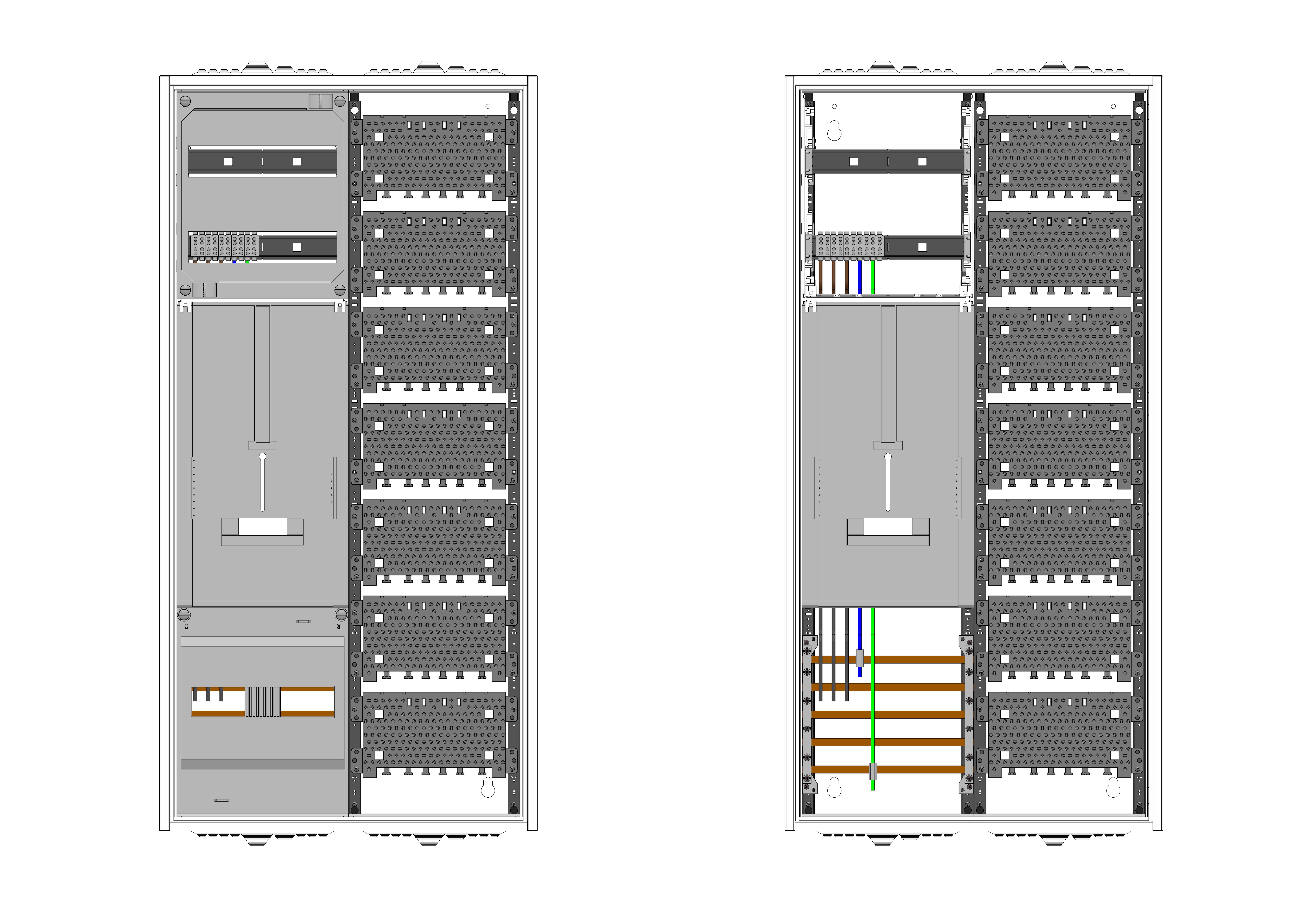 AZ22BM-210, Zählerverteilung HEART mit 3-Punktbefestignach VDE 0603, DIN43870, 4100:2019-04 für den Innenbereich für Wandbefestigung AP/UP, Fabr. Alphatec, BxHxT [mm] = 550x1100x210, Schutzklasse II, IP41, RAL 9016, Bestehend aus: Gehäuse, Einzel- bzw. Doppeltür mit Drehriegel, Flansche NF1 (oben + unten) und Berührungsschutzabdeckungen, Easy-Fix Befestigungssystem zur einfachen Aufhängung";" flexible Seitenleisten für eine einfache Hutschienenmontage auf verschiedenen Ebenen";" zusätzliche Klemmvorrichtungen für Steckklemmen";", aufgebaut wie folgt: 1xZählerplatz, Medienfeld, externer APZ erforderlich, inkl. Querverdrahtung, komplett zusammengebaut und verdrahtet gemäß VNB.0039