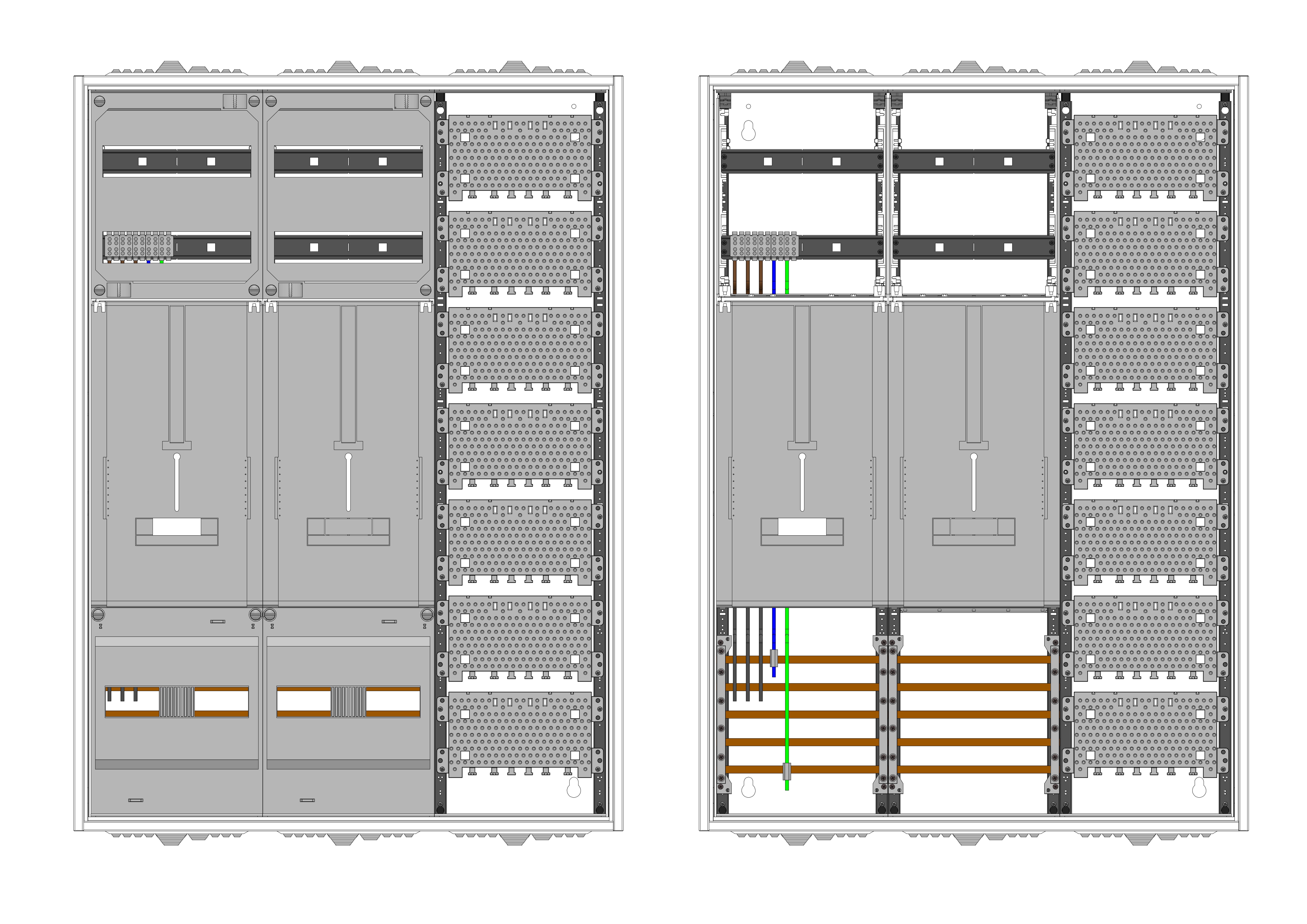 AZ32BM-230, Zählerverteilung mit 3-Punktnach VDE 0603, DIN43870, 4100:2019-04 für den Innenbereich für Wandbefestigung AP/UP, Fabr. Alphatec, BxHxT [mm] = 800x1100x230, Schutzklasse II, IP54, RAL 7035, Bestehend aus: Gehäuse, Einzel- bzw. Doppeltür mit Drehriegel, Flansche SF45 (oben) und SF41 (unten) und Berührungsschutzabdeckungen, aufgebaut wie folgt: 1xZählerplatz, TSG, Medienfeld, externer APZ erforderlich, inkl. Querverdrahtung, komplett zusammengebaut und verdrahtet gemäß VNB.0162