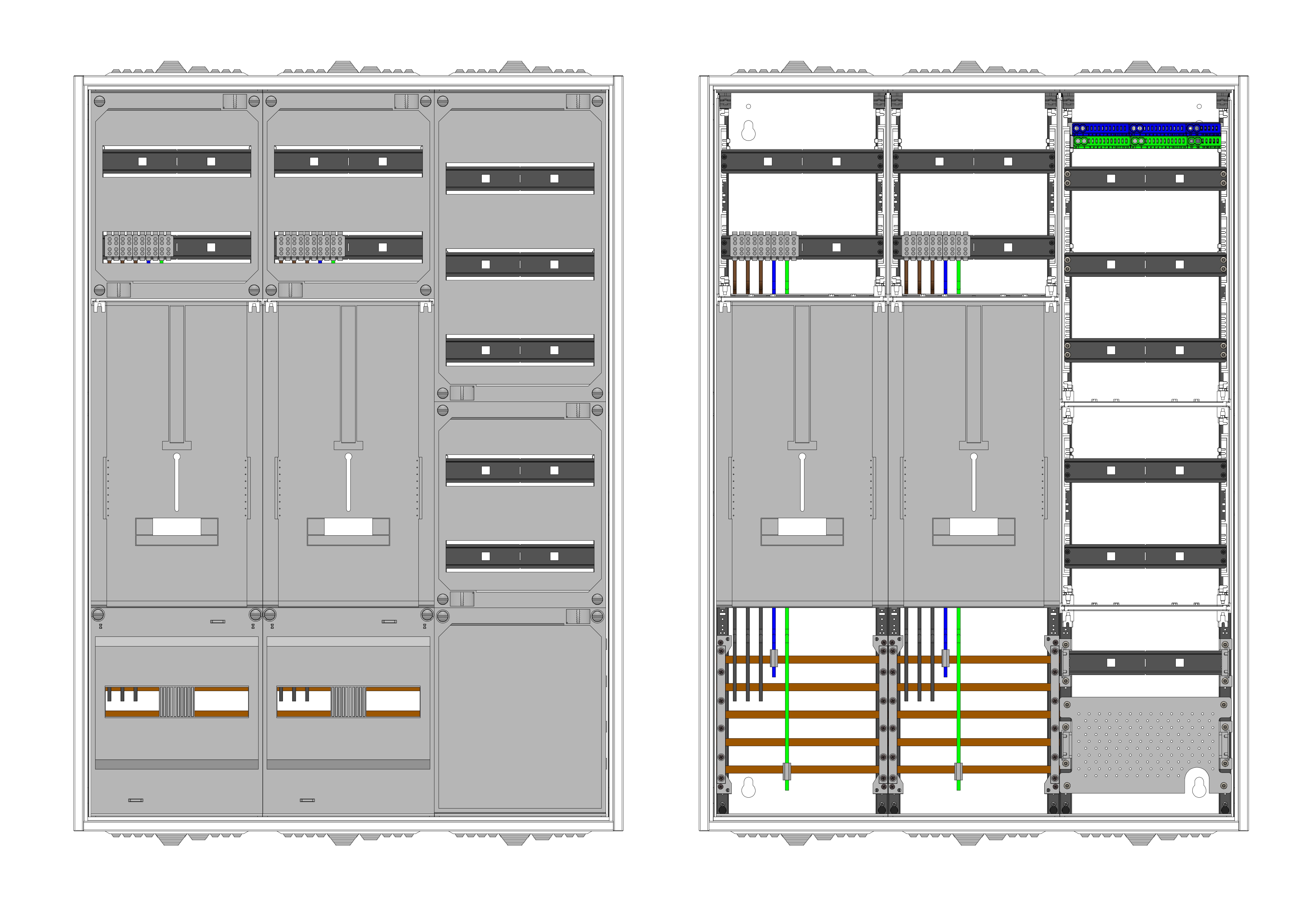 AZ32BSA-230-2, Zählerverteilung für Zählerplatz mit 3-Punktbefestigung nach VDE 0603, DIN43870, 4100:2019-04 für den Innenbereich für Wandbefestigung AP/UP, Fabr. Alphatec, BxHxT [mm] = 800x1100x230, Schutzklasse II, IP54, RAL 7035, Bestehend aus: Gehäuse, Doppeltür mit Schwenkhebel für Profilhalbzylinder, Flansche SF45 (oben) und SF41 (unten) und Berührungsschutzabdeckungen, aufgebaut wie folgt: 2x Zählerplatz, 5x Hutschienen in Verteilerfeld 1 (12TE), 1x APZ in Verteilerfeld 1, inkl. Querverdrahtung, komplett zusammengebaut und verdrahtet gemäß VNB.0001