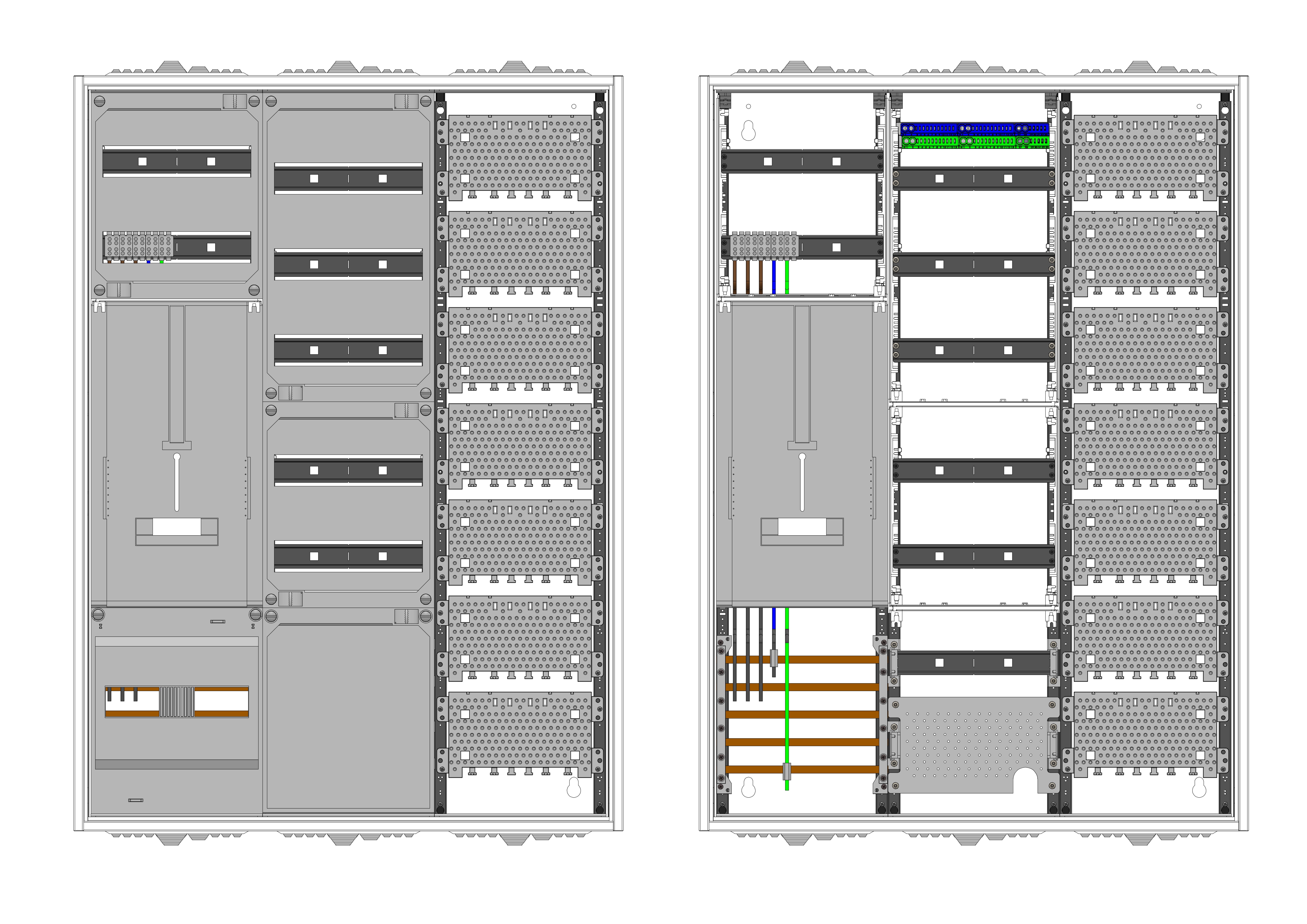AZ32BSAM-230, Zählerverteilung für Zählerplatz mit 3-Punktbefestigung nach VDE 0603, DIN43870, 4100:2019-04 für den Innenbereich für Wandbefestigung AP/UP, Fabr. Alphatec, BxHxT [mm] = 800x1100x230, Schutzklasse II, IP54, RAL 7035, Bestehend aus: Gehäuse, Doppeltür mit Schwenkhebel für Profilhalbzylinder, Flansche SF45 (oben) und SF41 (unten) und Berührungsschutzabdeckungen, aufgebaut wie folgt: 1x Zählerplatz, 5x Hutschienen in Verteilerfeld 1 (12TE), 1x APZ in Verteilerfeld 1, 7x HE in Medienfeld 1 Feld, inkl. Querverdrahtung, komplett zusammengebaut und verdrahtet gemäß VNB.0001