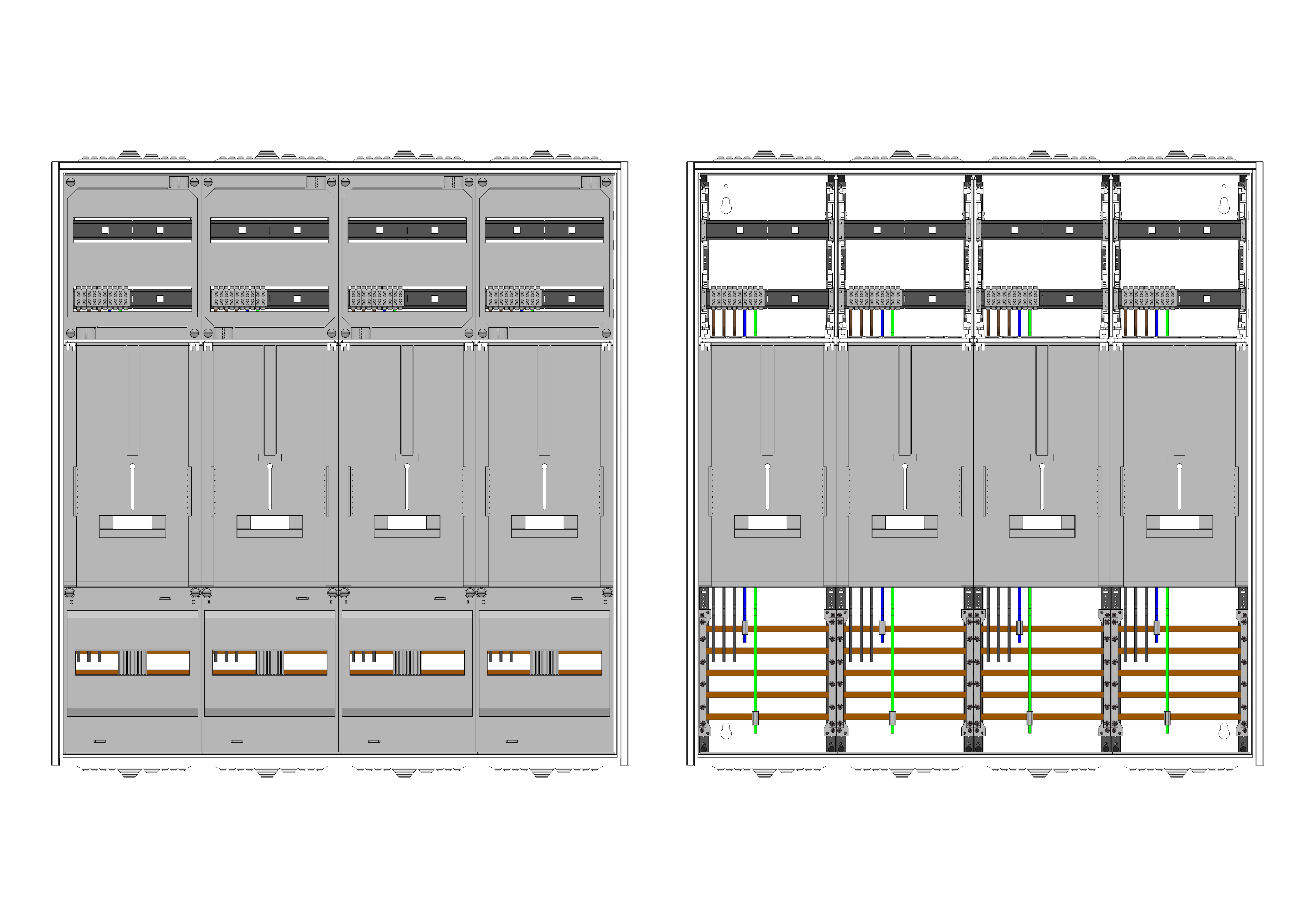 AZ42B-230, Zählerverteilung für Zählerplatz mit 3-Punktbefestigung nach VDE 0603, DIN43870, 4100:2019-04 für den Innenbereich für Wandbefestigung AP/UP, Fabr. Alphatec, BxHxT [mm] = 1050x1100x230, Schutzklasse II, IP54, RAL 7035, Bestehend aus: Gehäuse, Doppeltür mit Schwenkhebel für Profilhalbzylinder, Flansche SF45 (oben) und SF41 (unten) und Berührungsschutzabdeckungen, aufgebaut wie folgt: 3x Zählerplatz, 1x TSG-Platte, inkl. Querverdrahtung, komplett zusammengebaut und verdrahtet gemäß VNB.0001