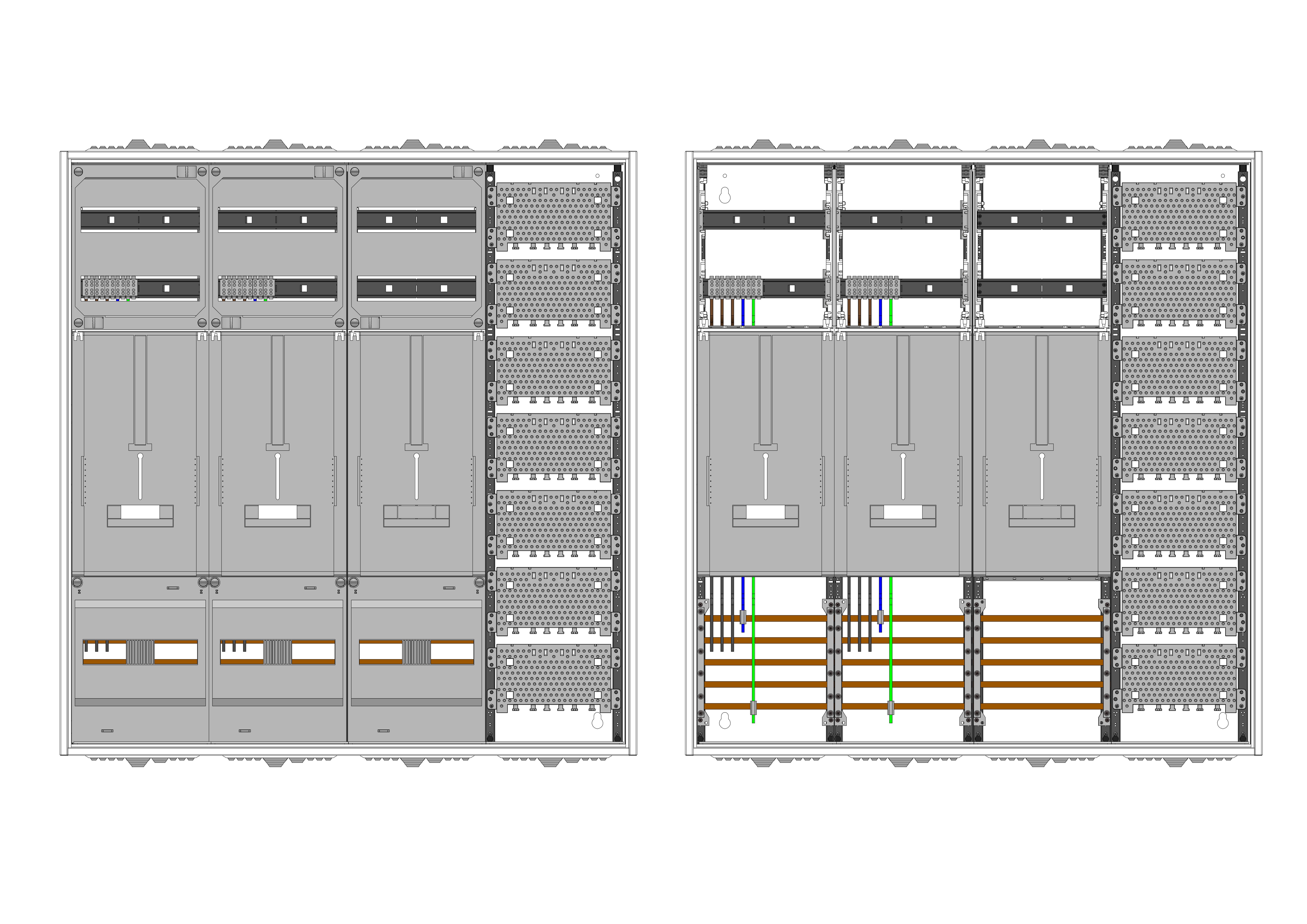 AZ42BM-230, Zählerverteilung mit 3-Punktnach VDE 0603, DIN43870, 4100:2019-04 für den Innenbereich für Wandbefestigung AP/UP, Fabr. Alphatec, BxHxT [mm] = 1050x1100x230, Schutzklasse II, IP54, RAL 7035, Bestehend aus: Gehäuse, Einzel- bzw. Doppeltür mit Drehriegel, Flansche SF45 (oben) und SF41 (unten) und Berührungsschutzabdeckungen, aufgebaut wie folgt: 2xZählerplatz, TSG, Medienfeld, externer APZ erforderlich, inkl. Querverdrahtung, komplett zusammengebaut und verdrahtet gemäß VNB.0166
