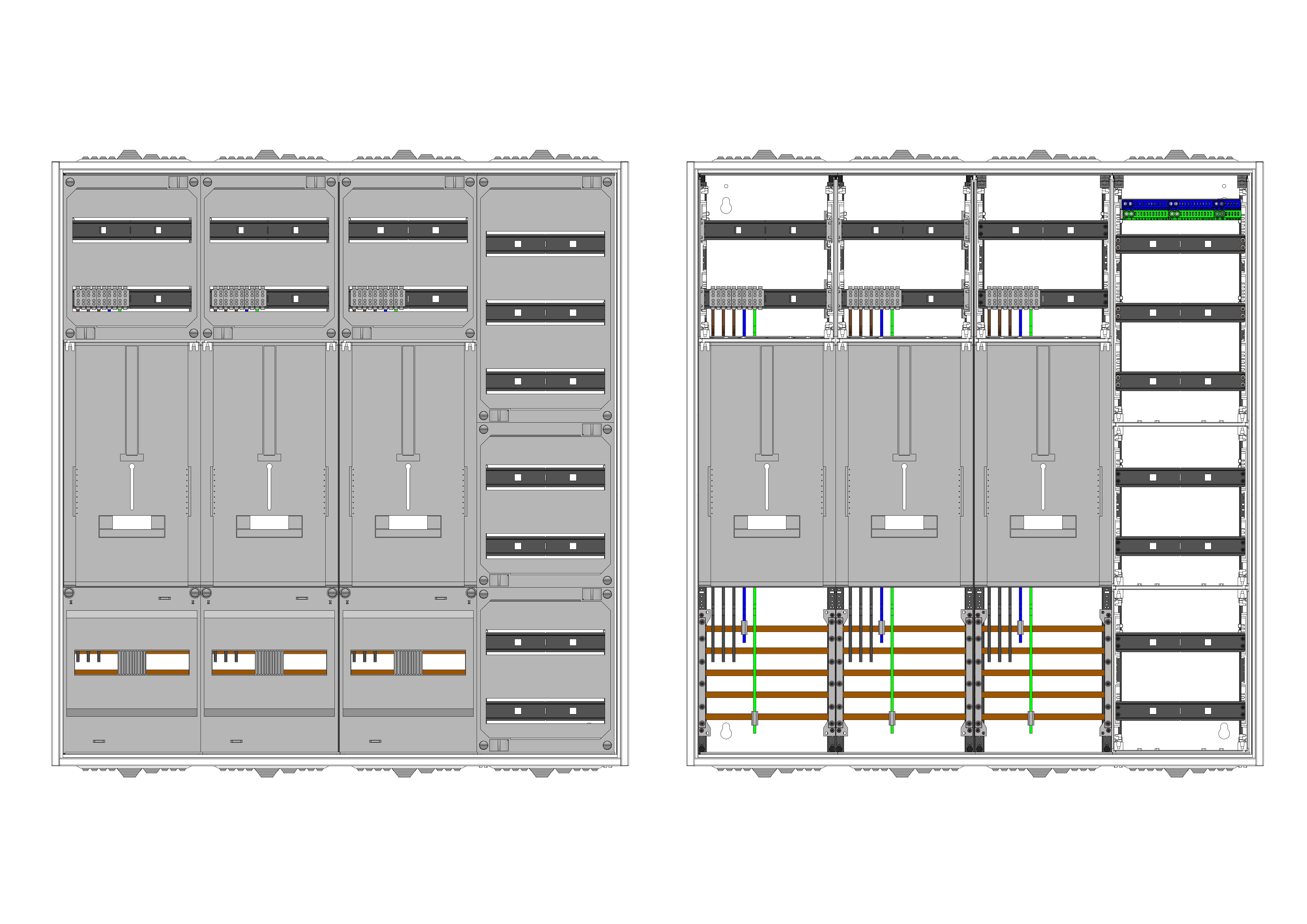 AZ42BS-230, Zählerverteilung für Zählerplatz mit 3-Punktbefestigung nach VDE 0603, DIN43870, 4100:2019-04 für den Innenbereich für Wandbefestigung AP/UP, Fabr. Alphatec, BxHxT [mm] = 1050x1100x230, Schutzklasse II, IP54, RAL 7035, Bestehend aus: Gehäuse, Doppeltür mit Schwenkhebel für Profilhalbzylinder, Flansche SF45 (oben) und SF41 (unten) und Berührungsschutzabdeckungen, aufgebaut wie folgt: 2x Zählerplatz, 1x TSG-Platte, 7x Hutschienen in Verteilerfeld 1 (12TE), inkl. Querverdrahtung, komplett zusammengebaut und verdrahtet gemäß VNB.0001