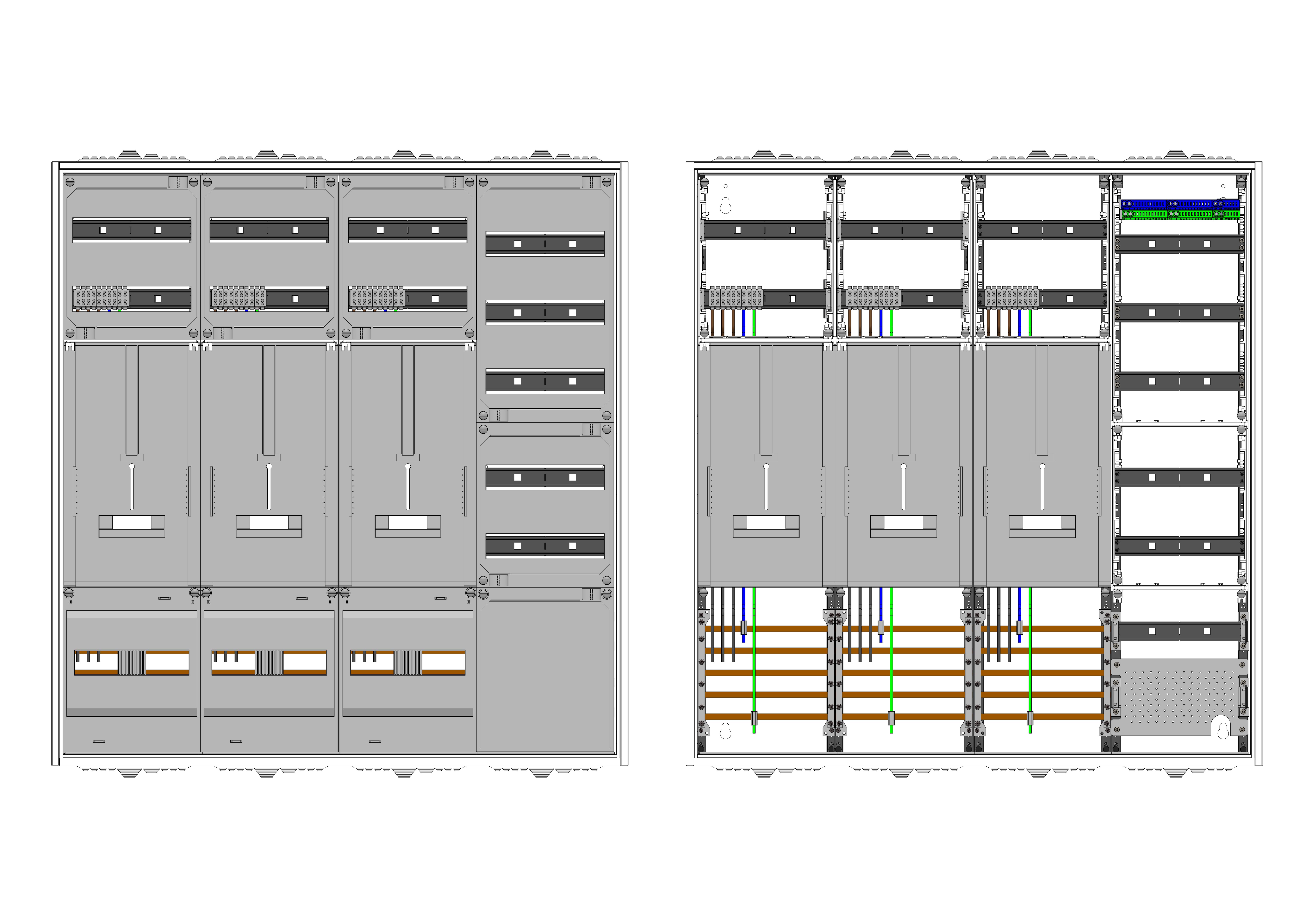 AZ42BSA-230, Zählerverteilung für Zählerplatz mit 3-Punktbefestigung nach VDE 0603, DIN43870, 4100:2019-04 für den Innenbereich für Wandbefestigung AP/UP, Fabr. Alphatec, BxHxT [mm] = 1050x1100x230, Schutzklasse II, IP54, RAL 7035, Bestehend aus: Gehäuse, Doppeltür mit Schwenkhebel für Profilhalbzylinder, Flansche SF45 (oben) und SF41 (unten) und Berührungsschutzabdeckungen, aufgebaut wie folgt: 2x Zählerplatz, 1x TSG-Platte, 5x Hutschienen in Verteilerfeld 1 (12TE), 1x APZ in Verteilerfeld 1, inkl. Querverdrahtung, komplett zusammengebaut und verdrahtet gemäß VNB.0001