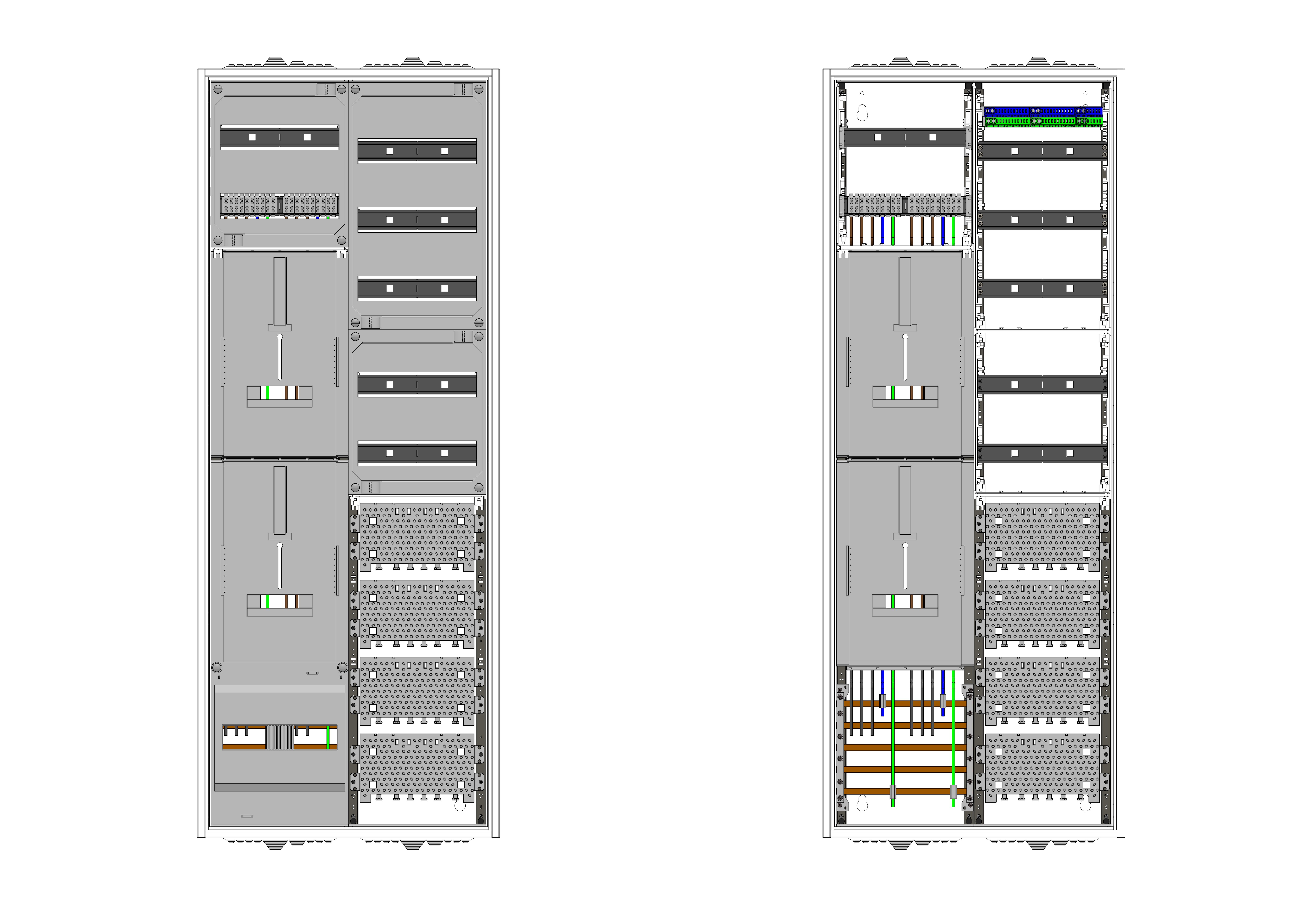 AZ42HS1M1-230, Zählerverteilung mit 3-Punktnach VDE 0603, DIN43870, 4100:2019-04 für den Innenbereich für Wandbefestigung AP/UP, Fabr. Alphatec, BxHxT [mm] = 550x1400x230, Schutzklasse II, IP54, RAL 7035, Bestehend aus: Gehäuse, Einzel- bzw. Doppeltür mit Drehriegel, Flansche SF45 (oben) und SF41 (unten) und Berührungsschutzabdeckungen, aufgebaut wie folgt: 1xZählerplatz, TSG, Verteilerfeld (12TE), Medienfeld, externer APZ erforderlich, inkl. Querverdrahtung, komplett zusammengebaut und verdrahtet gemäß VNB.0131
