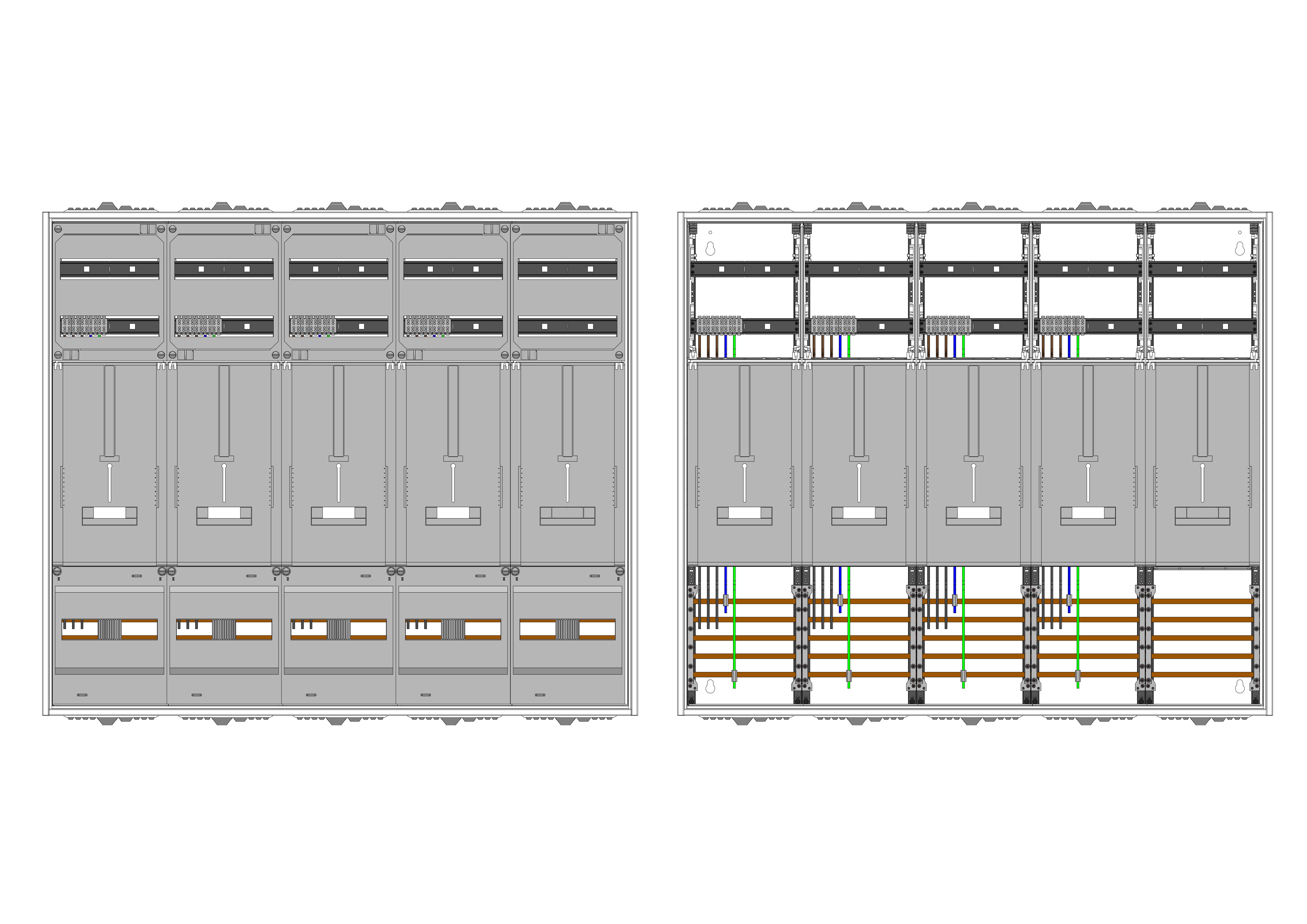 AZ52B-230, Zählerverteilung für Zählerplatz mit 3-Punktbefestigung nach VDE 0603, DIN43870, 4100:2019-04 für den Innenbereich für Wandbefestigung AP/UP, Fabr. Alphatec, BxHxT [mm] = 1300x1100x230, Schutzklasse II, IP54, RAL 7035, Bestehend aus: Gehäuse, Doppeltür mit Schwenkhebel für Profilhalbzylinder, Flansche SF45 (oben) und SF41 (unten) und Berührungsschutzabdeckungen, aufgebaut wie folgt: 4x Zählerplatz, 1x TSG-Platte, inkl. Querverdrahtung, komplett zusammengebaut und verdrahtet gemäß VNB.0001