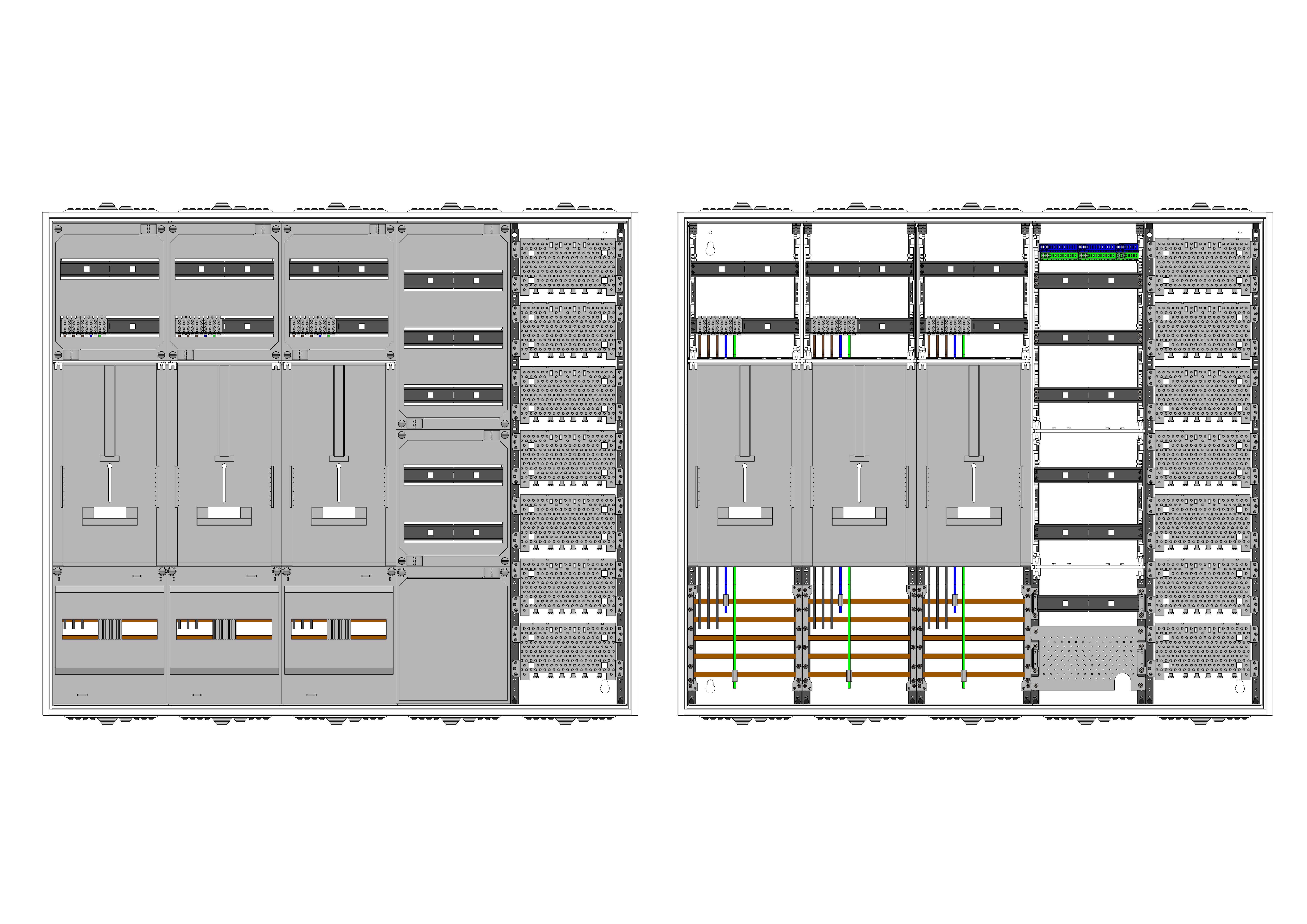 AZ52BSAM-230, Zählerverteilung für Zählerplatz mit 3-Punktbefestigung nach VDE 0603, DIN43870, 4100:2019-04 für den Innenbereich für Wandbefestigung AP/UP, Fabr. Alphatec, BxHxT [mm] = 1300x1100x230, Schutzklasse II, IP54, RAL 7035, Bestehend aus: Gehäuse, Doppeltür mit Schwenkhebel für Profilhalbzylinder, Flansche SF45 (oben) und SF41 (unten) und Berührungsschutzabdeckungen, aufgebaut wie folgt: 2x Zählerplatz, 1x TSG-Platte, 5x Hutschienen in Verteilerfeld 1 (12TE), 1x APZ in Verteilerfeld 1, 7x HE in Medienfeld 1 Feld, inkl. Querverdrahtung, komplett zusammengebaut und verdrahtet gemäß VNB.0001