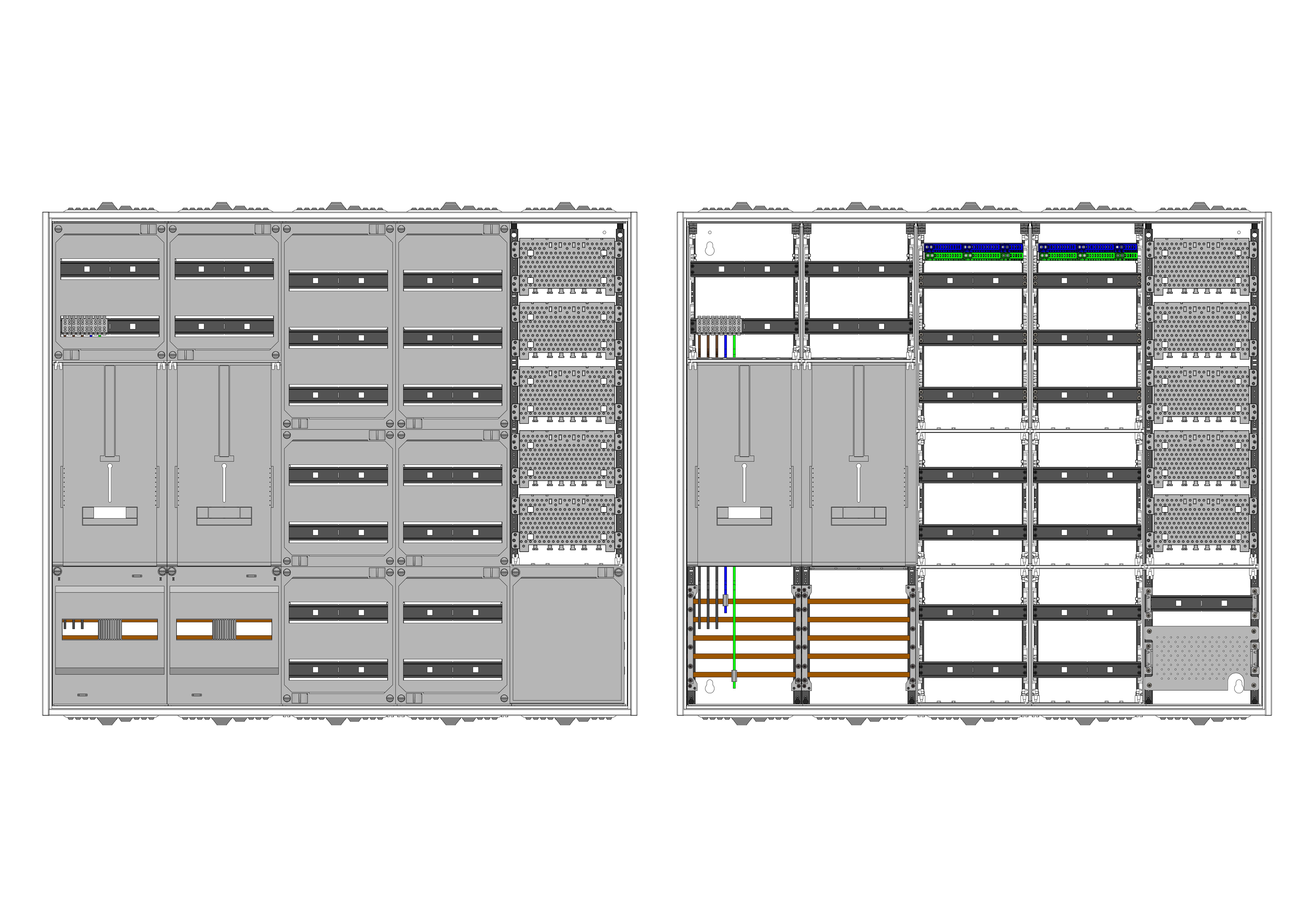AZ52BSSMA-230, Zählerverteilung für Zählerplatz mit 3-Punktbefestigung nach VDE-AR-N 4100:2026-04 für den Innenbereich für Wandbefestigung AP/UP, Fabr. Alphatec, BxHxT [mm] = 1300x1100x230, Schutzklasse II, IP54, RAL 7035, Bestehend aus: Gehäuse, Doppeltür mit Schwenkhebel für Profilhalbzylinder, Flansche SF45 (oben) und SF41 (unten) und Berührungsschutzabdeckungen, aufgebaut wie folgt: 1x Zählerplatz, 1x TSG-Platte, 7x Hutschienen in Verteilerfeld 1 (12TE), 7x Hutschienen in Verteilerfeld 2 (12TE), 5x HE in Medienfeld 1 Feld breit inkl. APZ, inkl. Querverdrahtung, komplett zusammengebaut und verdrahtet gemäß VNB.0001