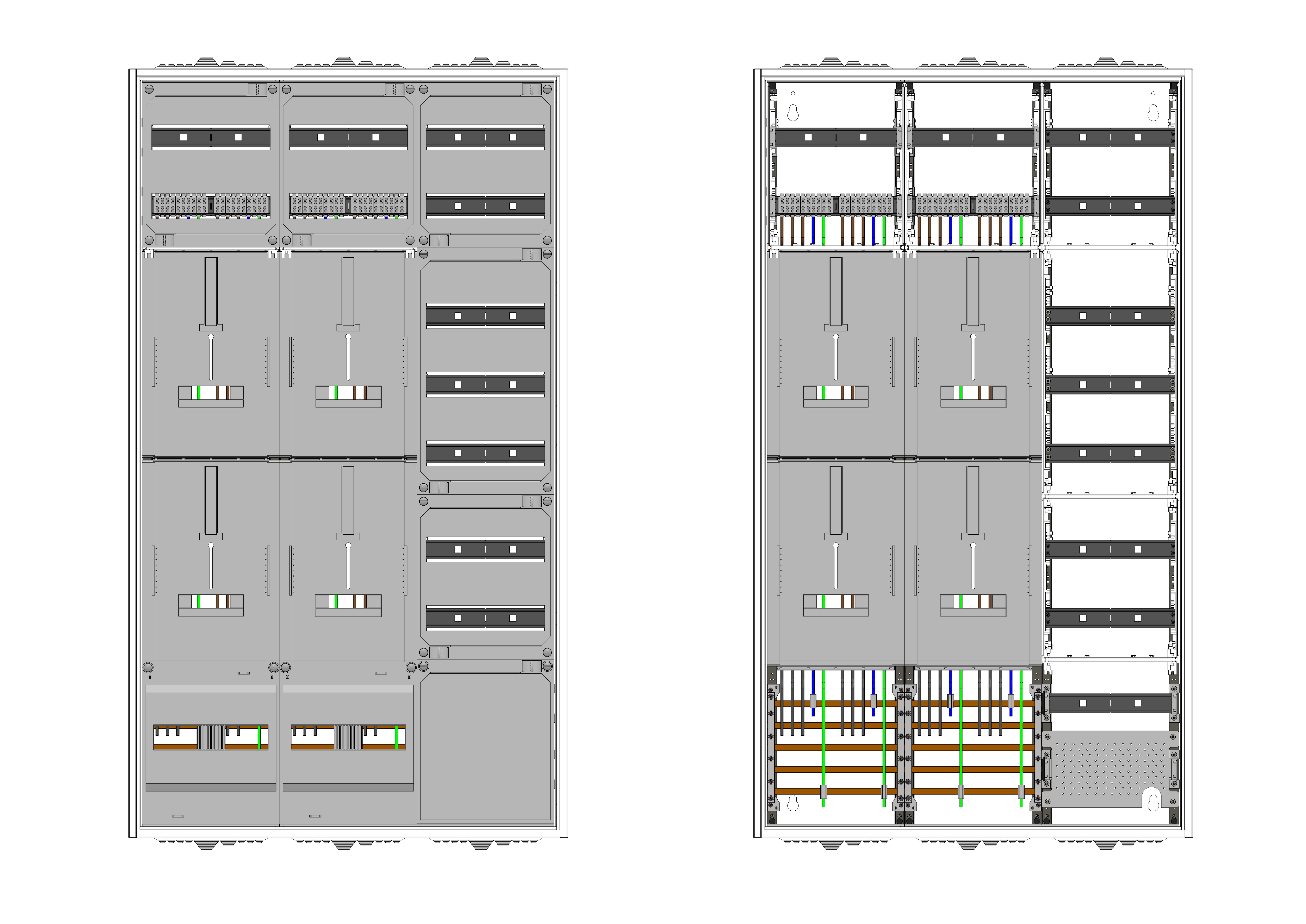 AZ62HS2A-230-3, Zählerverteilung mit 3-Punktbefestignach VDE 0603, DIN43870, 4100:2019-04 für den Innenbereich für Wandbefestigung AP/UP, Fabr. Alphatec, BxHxT [mm] = 800x1400x230, Schutzklasse II, IP54, RAL 7035, Bestehend aus:Bestehend aus: Gehäuse, Einzel- bzw. Doppeltür mit Drehriegel, Flansche SF45 (oben) und SF41 (unten) und Berührungsschutzabdeckungen, aufgebaut wie folgt: 3xZählerplatz, 1x TSG-Platz, Verteilerfeld (12TE), APZ in Verteilerfeld, inkl. Querverdrahtung, komplett zusammengebaut und verdrahtet gemäß VNB.0181