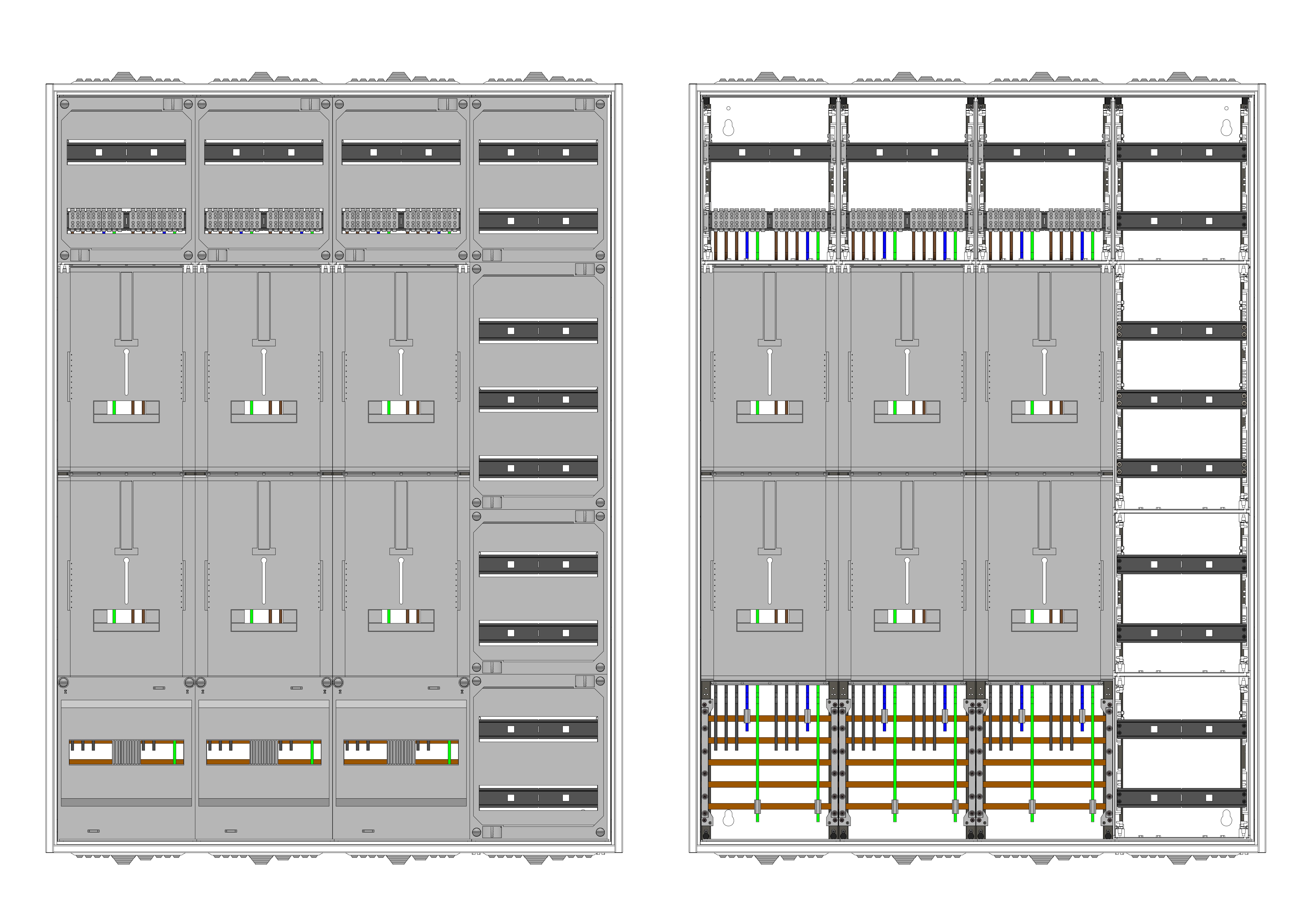 AZ82HS2-230, Zählerverteilung mit 3-Punktnach VDE 0603, DIN43870, 4100:2019-04 für den Innenbereich für Wandbefestigung AP/UP, Fabr. Alphatec, BxHxT [mm] = 1050x1400x230, Schutzklasse II, IP54, RAL 7035, Bestehend aus: Gehäuse, Einzel- bzw. Doppeltür mit Drehriegel, Flansche SF45 (oben) und SF41 (unten) und Berührungsschutzabdeckungen, aufgebaut wie folgt: 5xZählerplatz, TSG, Verteilerfeld (12TE), externer APZ erforderlich, inkl. Querverdrahtung, komplett zusammengebaut und verdrahtet gemäß VNB.0142