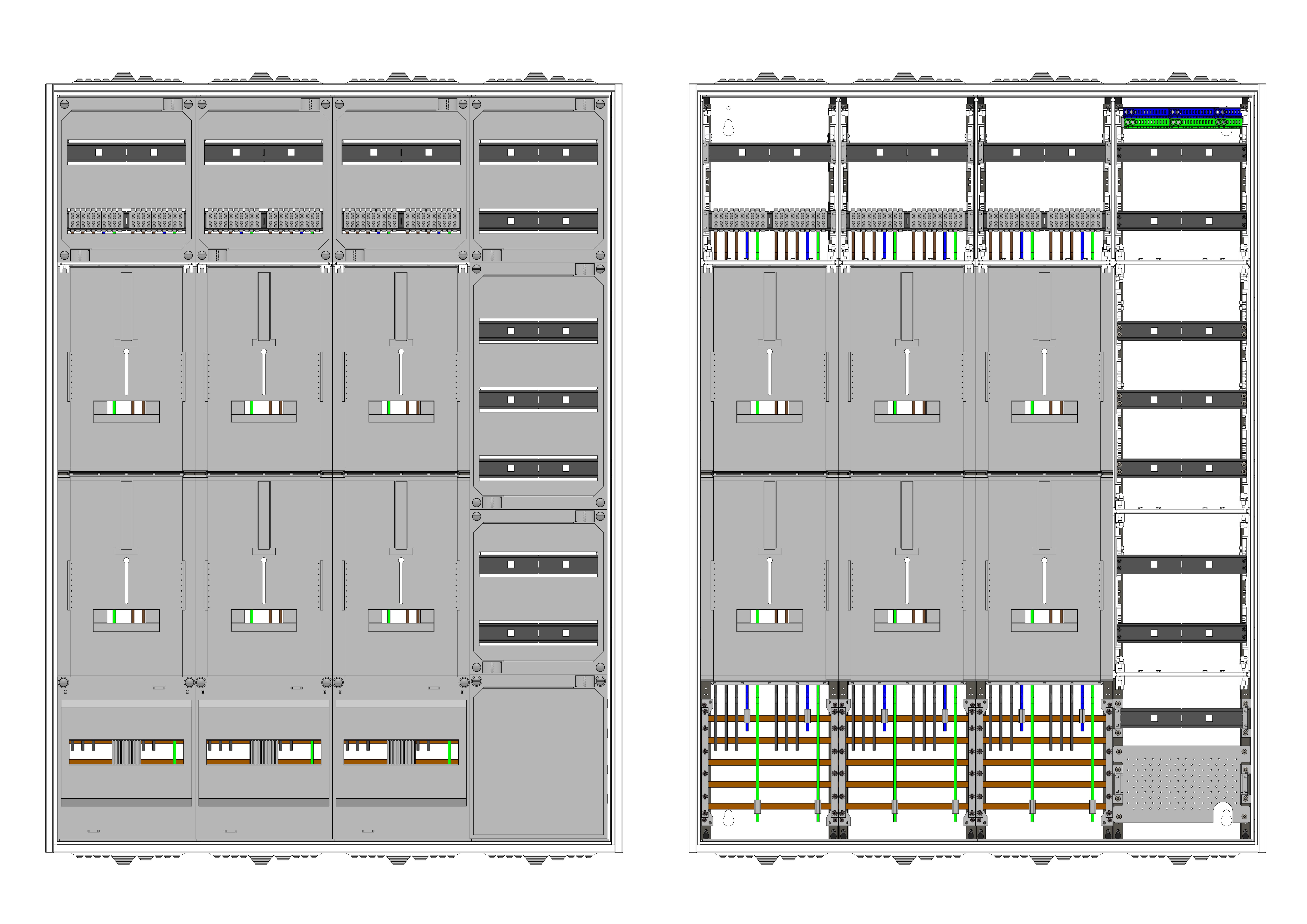 AZ82HS2A-230, Zählerverteilung mit 3-Punktnach VDE 0603, DIN43870, 4100:2019-04 für den Innenbereich für Wandbefestigung AP/UP, Fabr. Alphatec, BxHxT [mm] = 1050x1400x230, Schutzklasse II, IP54, RAL 7035, Bestehend aus: Gehäuse, Einzel- bzw. Doppeltür mit Drehriegel, Flansche SF45 (oben) und SF41 (unten) und Berührungsschutzabdeckungen, aufgebaut wie folgt: 5xZählerplatz, TSG, Verteilerfeld (12TE), APZ in Verteilerfeld, inkl. Querverdrahtung, komplett zusammengebaut und verdrahtet gemäß VNB.0189