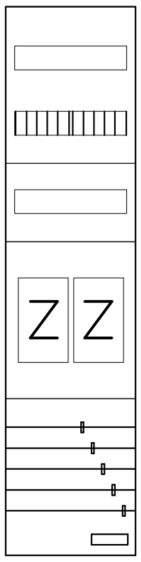 - Bestehend aus: Gehäuse, Einzeltür mit Schwenkhebel für Profilhalbzylinder, Flansche SF45 (oben) und SF41 (unten) und Berührungsschutzabdeckungen, aufgebaut wie folgt: 2x Zählerplatz, komplett zusammengebaut und verdrahtet gemäß VNB.0001