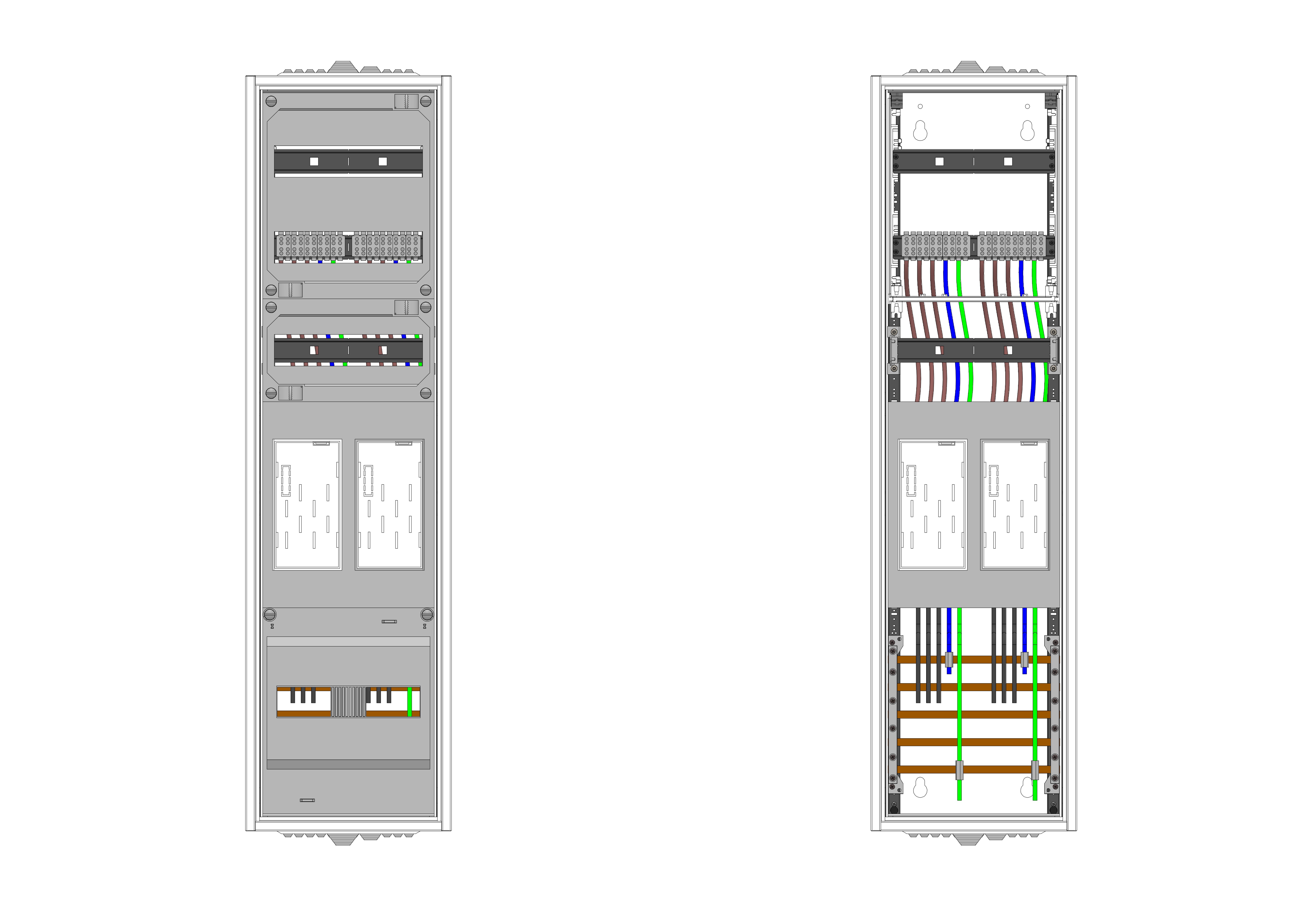 AEZ12-230-002, eHZ-Zählerverteilung nach VDE 0603, DIN43870, 4100:2019-04 für den Innenbereich für Wandbefestigung AP/UP, Fabr. Alphatec, BxHxT [mm] = 300x1100x230, Schutzklasse II, IP54, RAL 7035, Bestehend aus: Gehäuse, Einzeltür mit Schwenkhebel für Profilhalbzylinder, Flansche SF45 (oben) und SF41 (unten) und Berührungsschutzabdeckungen, aufgebaut wie folgt: 2x Zählerplatz, komplett zusammengebaut und verdrahtet gemäß VNB.0001