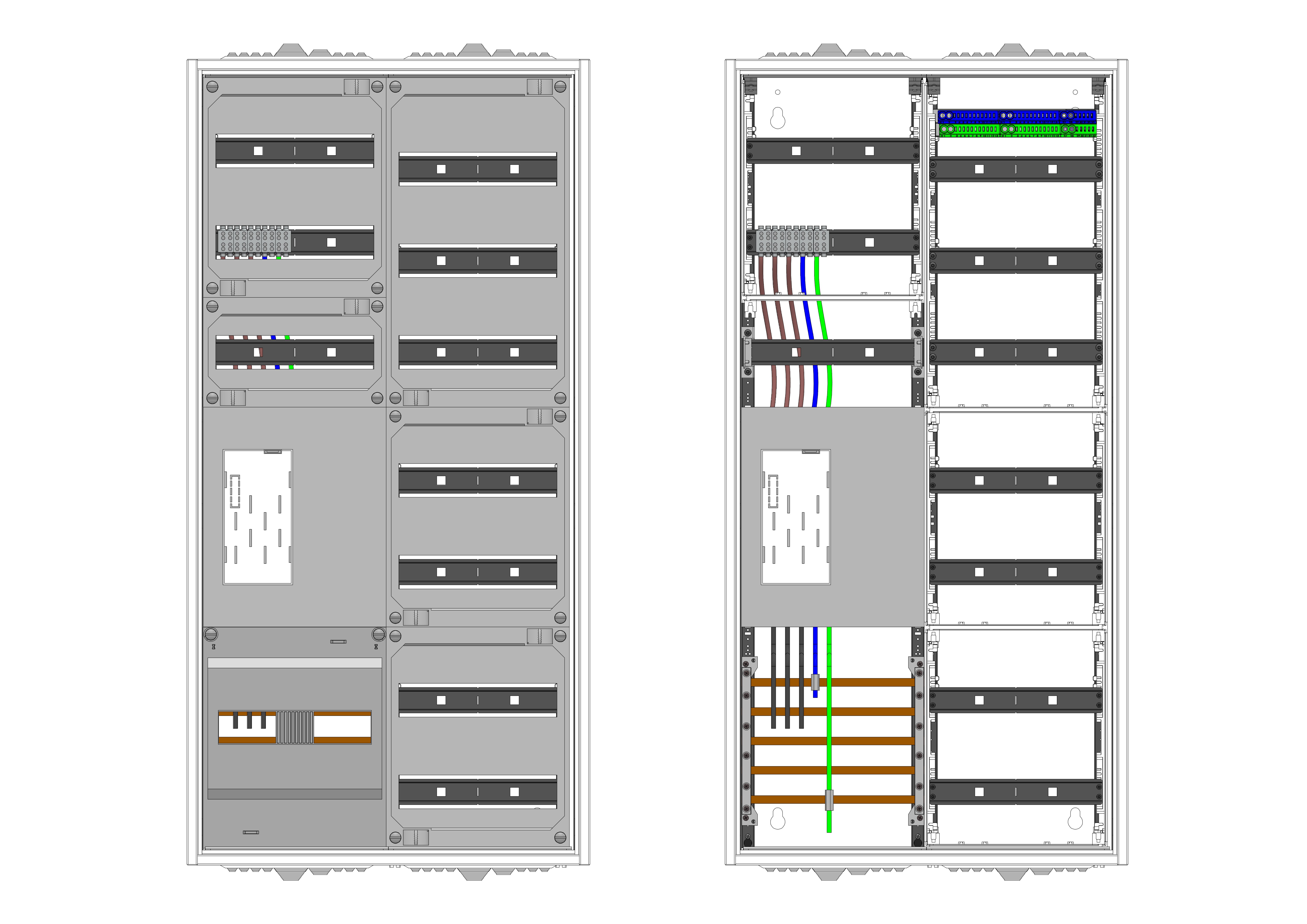 AEZ22-210-001, eHZ-Zählerverteilung HEART nach VDE 0603, DIN43870, 4100:2019-04 für den Innenbereich für Wandbefestigung AP/UP, Fabr. Alphatec, BxHxT [mm] = 550x1100x210, Schutzklasse II, IP41, RAL 9016, Bestehend aus: Gehäuse, Einzeltür mit Drehriegel, Flansche NF1 (oben + unten) und Berührungsschutzabdeckungen, Easy-Fix Befestigungssystem zur einfachen Aufhängung";" flexible Seitenleisten für eine einfache Hutschienenmontage auf verschiedenen Ebenen";" zusätzliche Klemmvorrichtungen für Steckklemmen";" aufgebaut wie folgt: 1x Zählerplatz, 1x TSG-Platte, 7x Hutschienen in Verteilerfeld 1 (12TE), geeignet für TSG-Hutschienenmontage: ja, inkl. Querverdrahtung, komplett zusammengebaut und verdrahtet gemäß VNB.0001