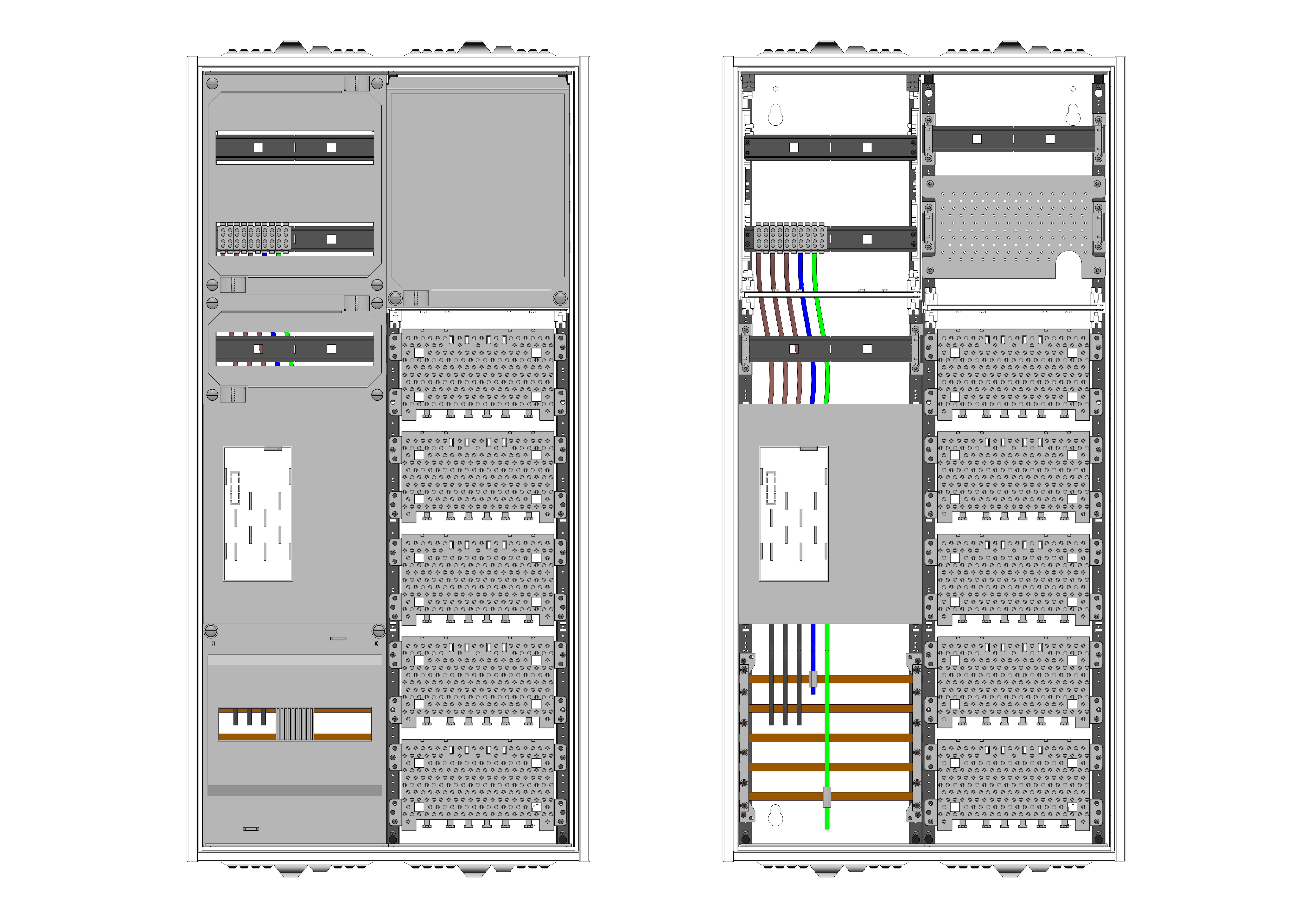 AEZ22-230-017, eHZ-Zählerverteilung VDE 0603, DIN43870, 4100:2019-04 für den Innenbereich für Wandbefestigung AP/UP, Fabr. Alphatec, BxHxT [mm] = 550x1100x230, Schutzklasse II, IP54, RAL 7035, Bestehend aus: Gehäuse, Einzel- bzw. Doppeltür mit Drehriegel, Flansche SF45 (oben) und SF41 (unten) und Berührungsschutzabdeckungen, aufgebaut wie folgt: 1xZählerplatz, APZ in Medienfeld, geeignet für TSG Hutschienenmontage, inkl. Querverdrahtung, komplett zusammengebaut und verdrahtet gemäß VNB.0095