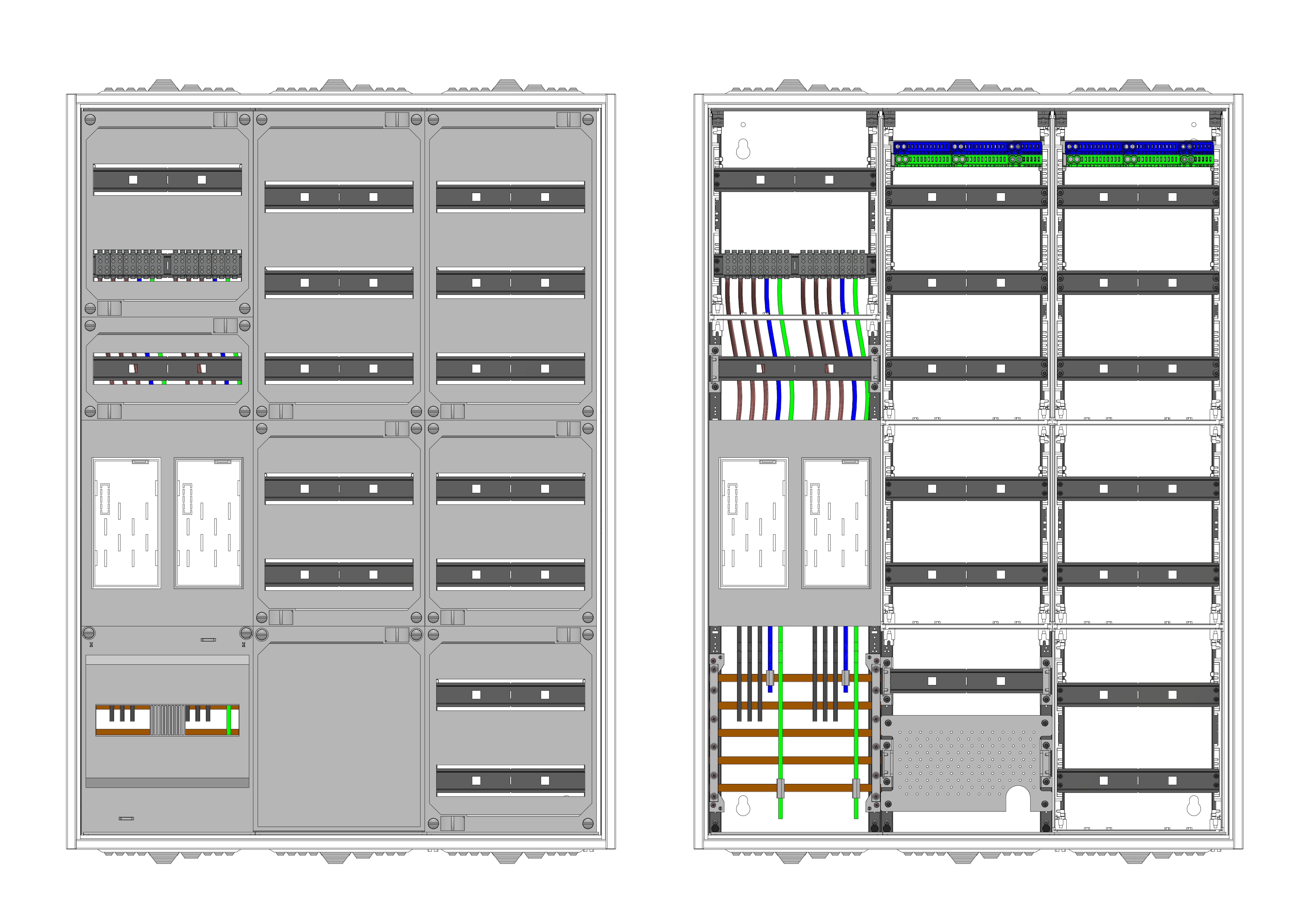 AEZ32-230-017, eHZ-Zählerverteilung nach VDE 0603, DIN43870, 4100:2019-04 für den Innenbereich für Wandbefestigung AP/UP, Fabr. Alphatec, BxHxT [mm] = 800x1100x230, Schutzklasse II, IP54, RAL 7035, Bestehend aus: Gehäuse, Doppeltür mit Schwenkhebel für Profilhalbzylinder, Flansche SF45 (oben) und SF41 (unten) und Berührungsschutzabdeckungen, aufgebaut wie folgt: 2x Zählerplatz, 5x Hutschienen in Verteilerfeld 1 (12TE), 1x APZ in Verteilerfeld 1, 7x Hutschienen in Verteilerfeld 2 (12TE), komplett zusammengebaut und verdrahtet gemäß VNB.0001