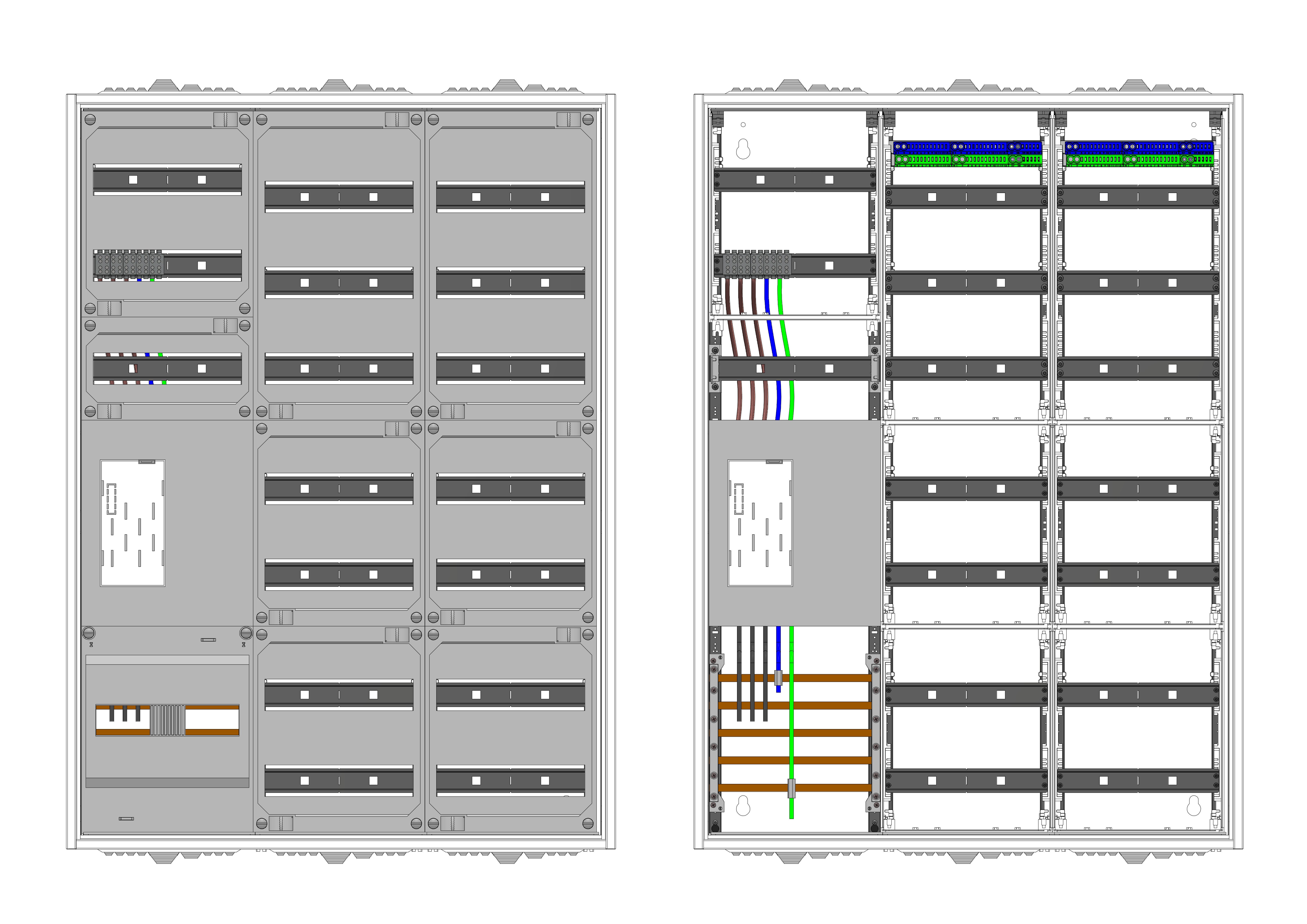 AEZ32-230-020, eHZ-Zählerverteilung nach VDE 0603, DIN43870, 4100:2019-04 für den Innenbereich für Wandbefestigung AP/UP, Fabr. Alphatec, BxHxT [mm] = 800x1100x230, Schutzklasse II, IP54, RAL 7035, Bestehend aus: Gehäuse, Doppeltür mit Schwenkhebel für Profilhalbzylinder, Flansche SF45 (oben) und SF41 (unten) und Berührungsschutzabdeckungen, aufgebaut wie folgt: 1x Zählerplatz, 1x TSG-Platte, 7x Hutschienen in Verteilerfeld 1 (12TE), 7x Hutschienen in Verteilerfeld 2 (12TE), geeignet für TSG-Hutschienenmontage: ja, inkl. Querverdrahtung, komplett zusammengebaut und verdrahtet gemäß VNB.0001