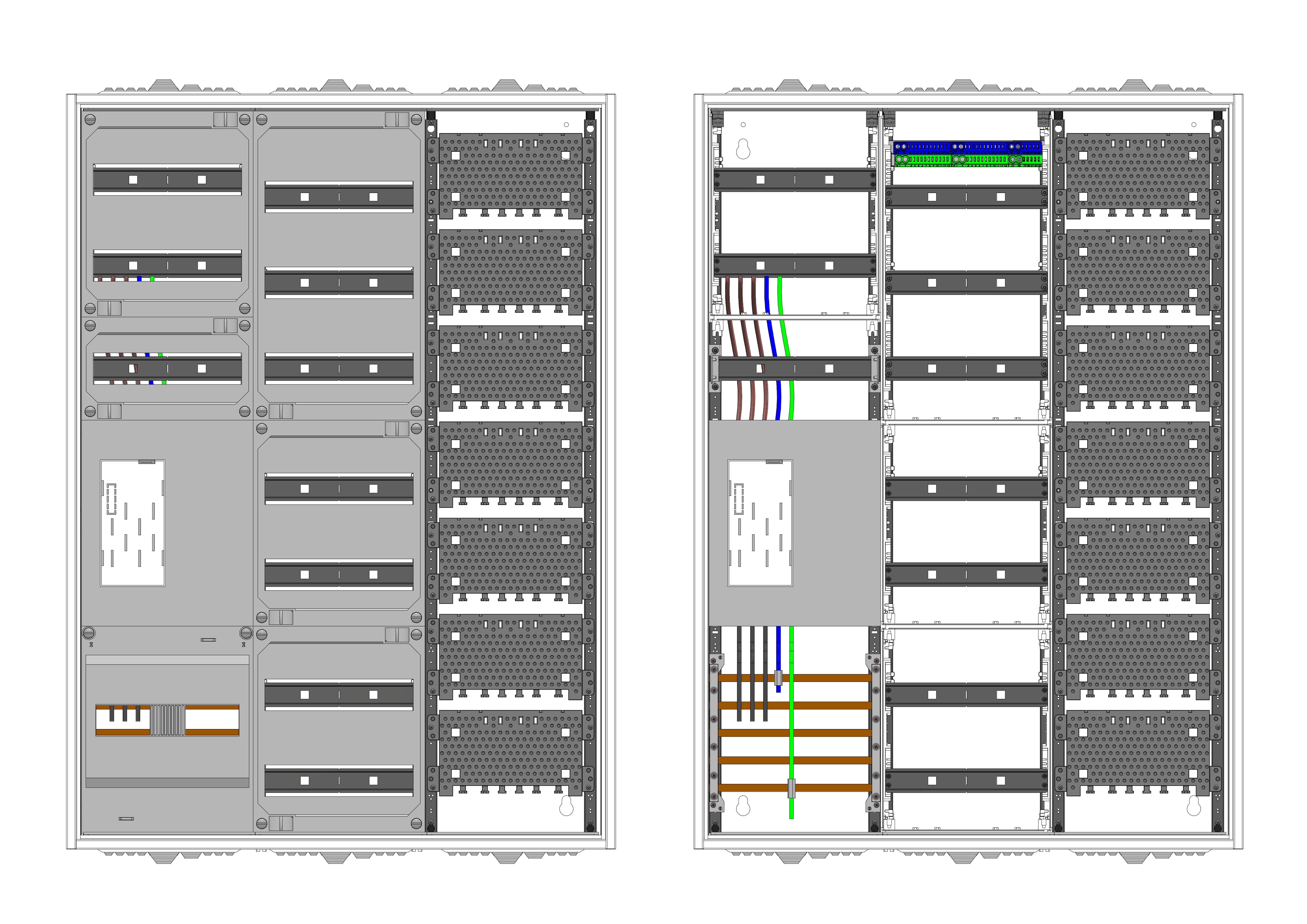 AEZ32-230-022, eHZ-Zählerverteilung nach VDE 0603, DIN43870, 4100:2019-04 für den Innenbereich für Wandbefestigung AP/UP, Fabr. Alphatec, BxHxT [mm] = 800x1100x230, Schutzklasse II, IP54, RAL 7035, Bestehend aus: Gehäuse, Doppeltür mit Schwenkhebel für Profilhalbzylinder, Flansche SF45 (oben) und SF41 (unten) und Berührungsschutzabdeckungen, aufgebaut wie folgt: 1x Zählerplatz, 1x TSG-Platte, 7x Hutschienen in Verteilerfeld 1 (12TE), 1x Medienfeld 1 Feld breit, geeignet für TSG-Hutschienenmontage: ja, inkl. Querverdrahtung, komplett zusammengebaut und verdrahtet gemäß VNB.0001