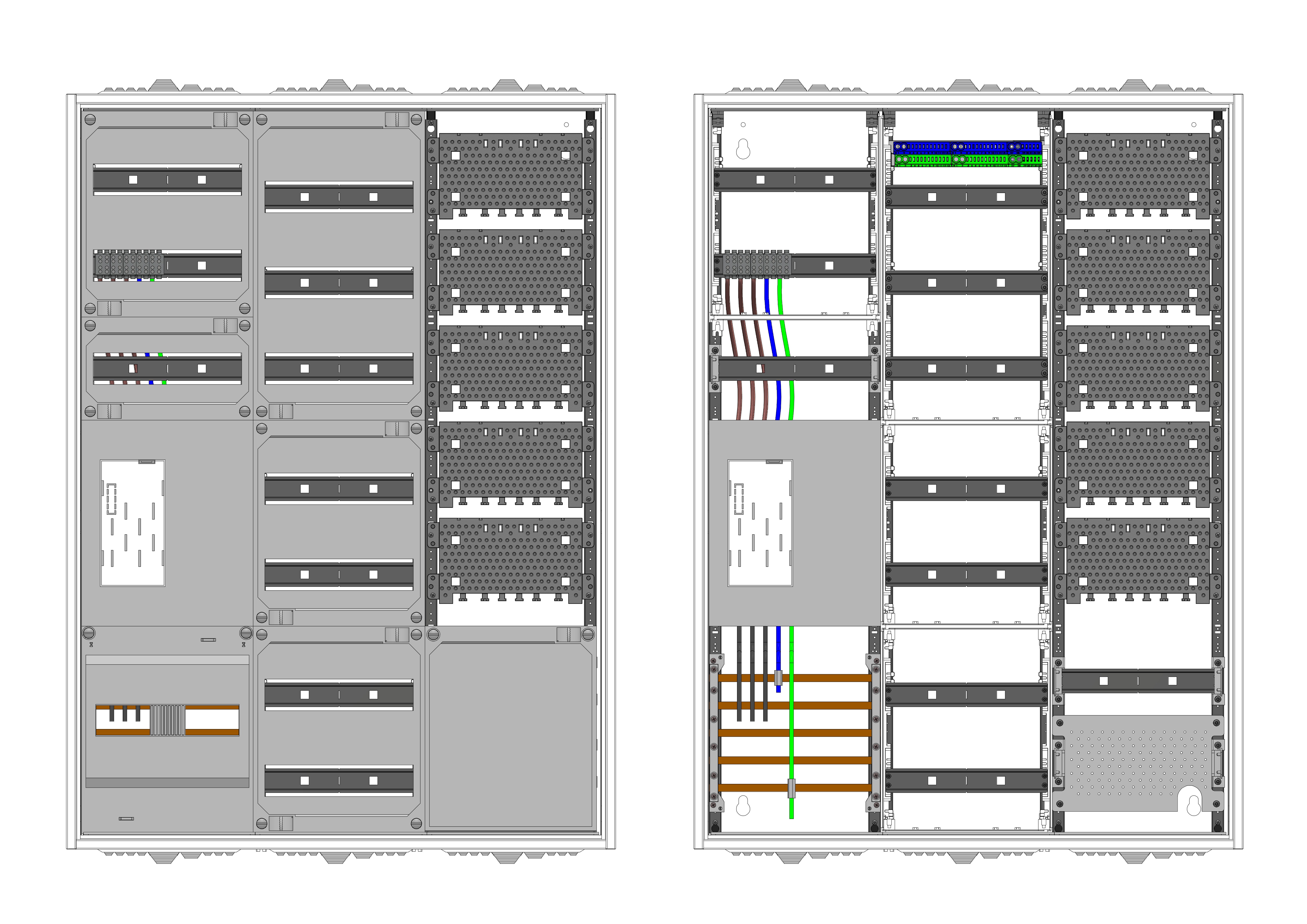 AEZ32-230-023, eHZ-Zählerverteilung nach VDE 0603, DIN43870, 4100:2019-04 für den Innenbereich für Wandbefestigung AP/UP, Fabr. Alphatec, BxHxT [mm] = 800x1100x230, Schutzklasse II, IP54, RAL 7035, Bestehend aus: Gehäuse, Doppeltür mit Schwenkhebel für Profilhalbzylinder, Flansche SF45 (oben) und SF41 (unten) und Berührungsschutzabdeckungen, aufgebaut wie folgt: 1x Zählerplatz, 1x TSG-Platte, 7x Hutschienen in Verteilerfeld 1 (12TE), 1x Medienfeld 1 Feld breit inkl. APZ, geeignet für TSG-Hutschienenmontage: ja, inkl. Querverdrahtung, komplett zusammengebaut und verdrahtet gemäß VNB.0001