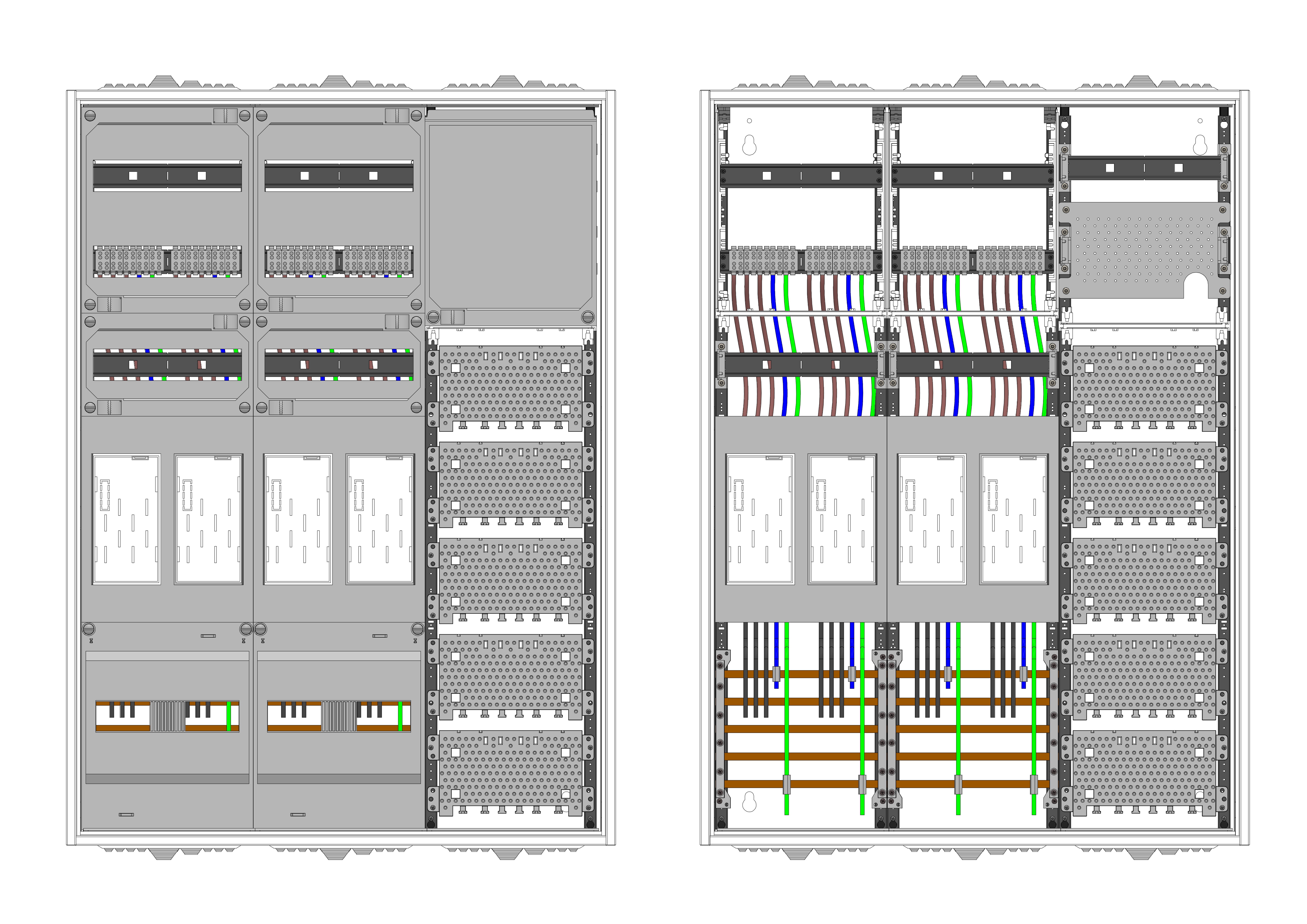 AEZ32-230-043, eHZ-Zählerverteilung VDE 0603, DIN43870, 4100:2019-04 für den Innenbereich für Wandbefestigung AP/UP, Fabr. Alphatec, BxHxT [mm] = 800x1100x230, Schutzklasse II, IP54, RAL 7035, Bestehend aus: Gehäuse, Einzel- bzw. Doppeltür mit Drehriegel, Flansche SF45 (oben) und SF41 (unten) und Berührungsschutzabdeckungen, aufgebaut wie folgt: 4xZählerplatz, APZ in Medienfeld, komplett zusammengebaut und verdrahtet gemäß VNB.0101