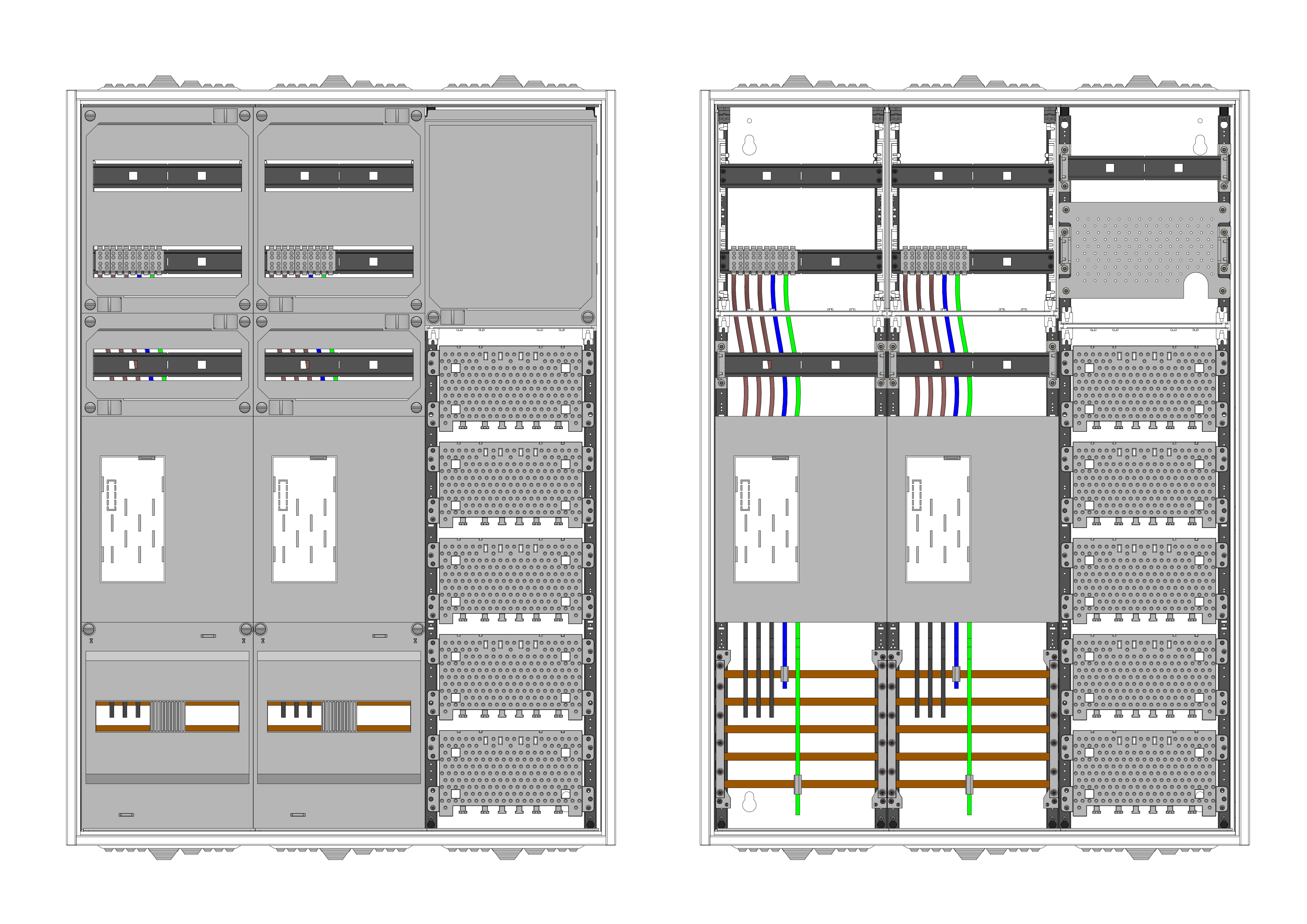 AEZ32-230-045, eHZ-Zählerverteilung VDE 0603, DIN43870, 4100:2019-04 für den Innenbereich für Wandbefestigung AP/UP, Fabr. Alphatec, BxHxT [mm] = 800x1100x230, Schutzklasse II, IP54, RAL 7035, Bestehend aus: Gehäuse, Einzel- bzw. Doppeltür mit Drehriegel, Flansche SF45 (oben) und SF41 (unten) und Berührungsschutzabdeckungen, aufgebaut wie folgt: 2xZählerplatz, TSG, APZ in Medienfeld, geeignet für TSG Hutschienenmontage, inkl. Querverdrahtung, komplett zusammengebaut und verdrahtet gemäß VNB.0103