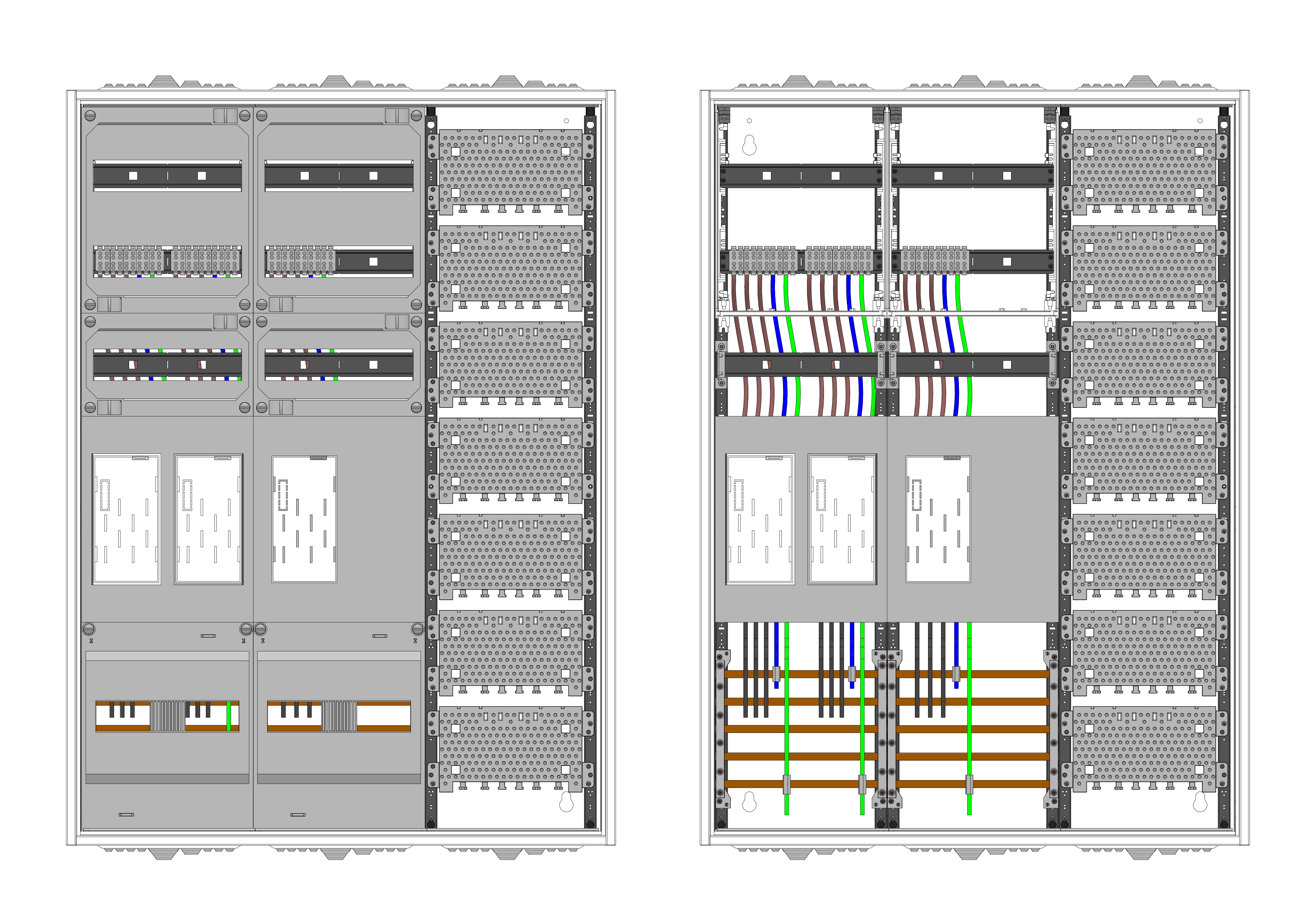 AEZ32-230-046, eHZ-Zählerverteilung VDE 0603, DIN43870, 4100:2019-04 für den Innenbereich für Wandbefestigung AP/UP, Fabr. Alphatec, BxHxT [mm] = 800x1100x230, Schutzklasse II, IP54, RAL 7035, Bestehend aus: Gehäuse, Einzel- bzw. Doppeltür mit Drehriegel, Flansche SF45 (oben) und SF41 (unten) und Berührungsschutzabdeckungen, aufgebaut wie folgt: 3xZählerplatz, Medienfeld, externer APZ erforderlich, geeignet für TSG Hutschienenmontage, inkl. Querverdrahtung, komplett zusammengebaut und verdrahtet gemäß VNB.0104