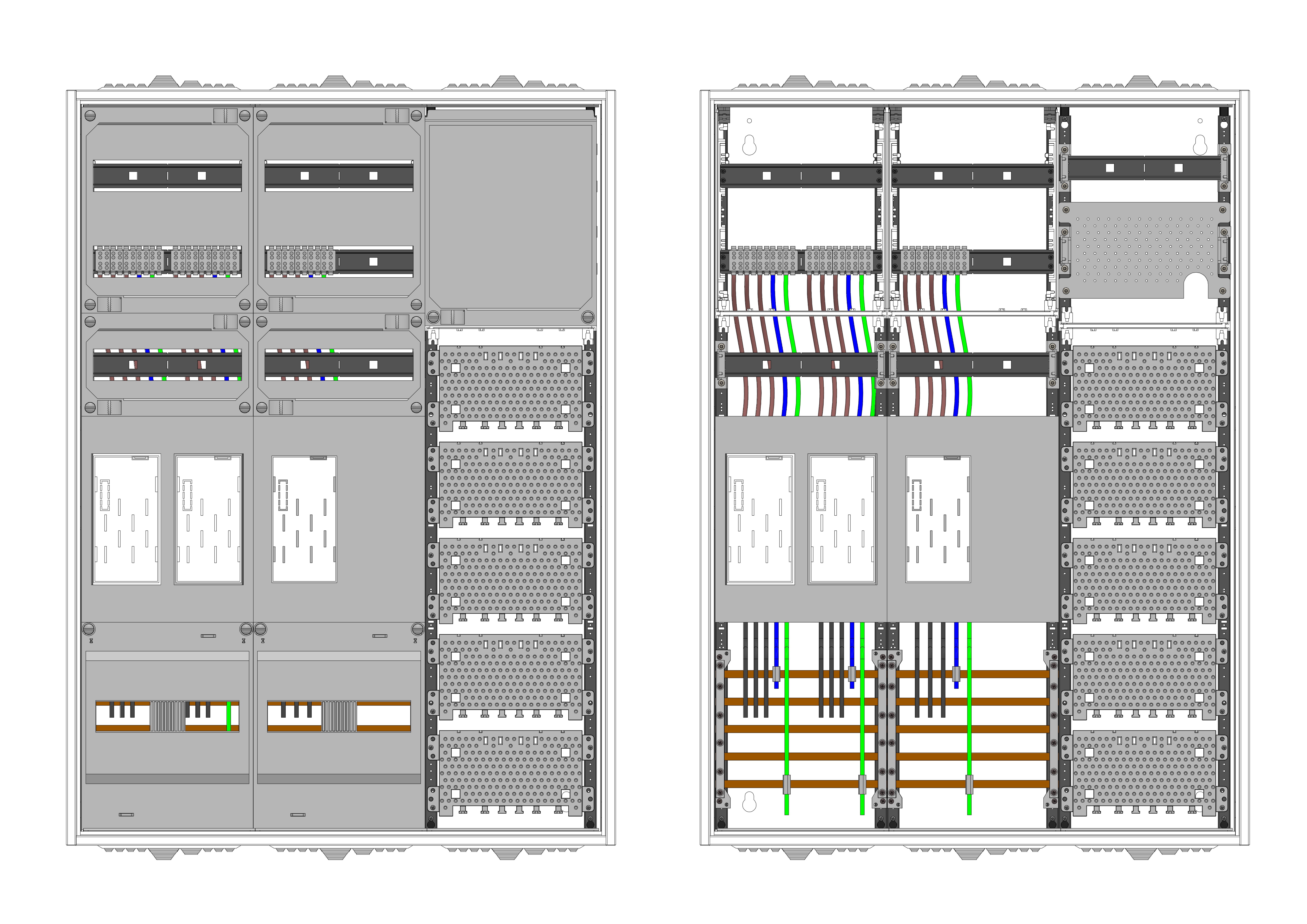 AEZ32-230-047, eHZ-Zählerverteilung VDE 0603, DIN43870, 4100:2019-04 für den Innenbereich für Wandbefestigung AP/UP, Fabr. Alphatec, BxHxT [mm] = 800x1100x230, Schutzklasse II, IP54, RAL 7035, Bestehend aus: Gehäuse, Einzel- bzw. Doppeltür mit Drehriegel, Flansche SF45 (oben) und SF41 (unten) und Berührungsschutzabdeckungen, aufgebaut wie folgt: 3xZählerplatz, APZ in Medienfeld, geeignet für TSG Hutschienenmontage, inkl. Querverdrahtung, komplett zusammengebaut und verdrahtet gemäß VNB.0105