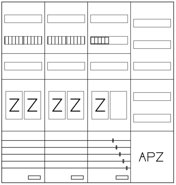 - Bestehend aus: Gehäuse, Doppeltür mit Drehriegel, Flansche NF1 (oben) und NF2 (unten) und Berührungsschutzabdeckungen, aufgebaut wie folgt: 5x Zählerplatz, 5x Hutschienen in Verteilerfeld 1 (12TE), 1x APZ in Verteilerfeld 1, komplett zusammengebaut und verdrahtet gemäß VNB.0001